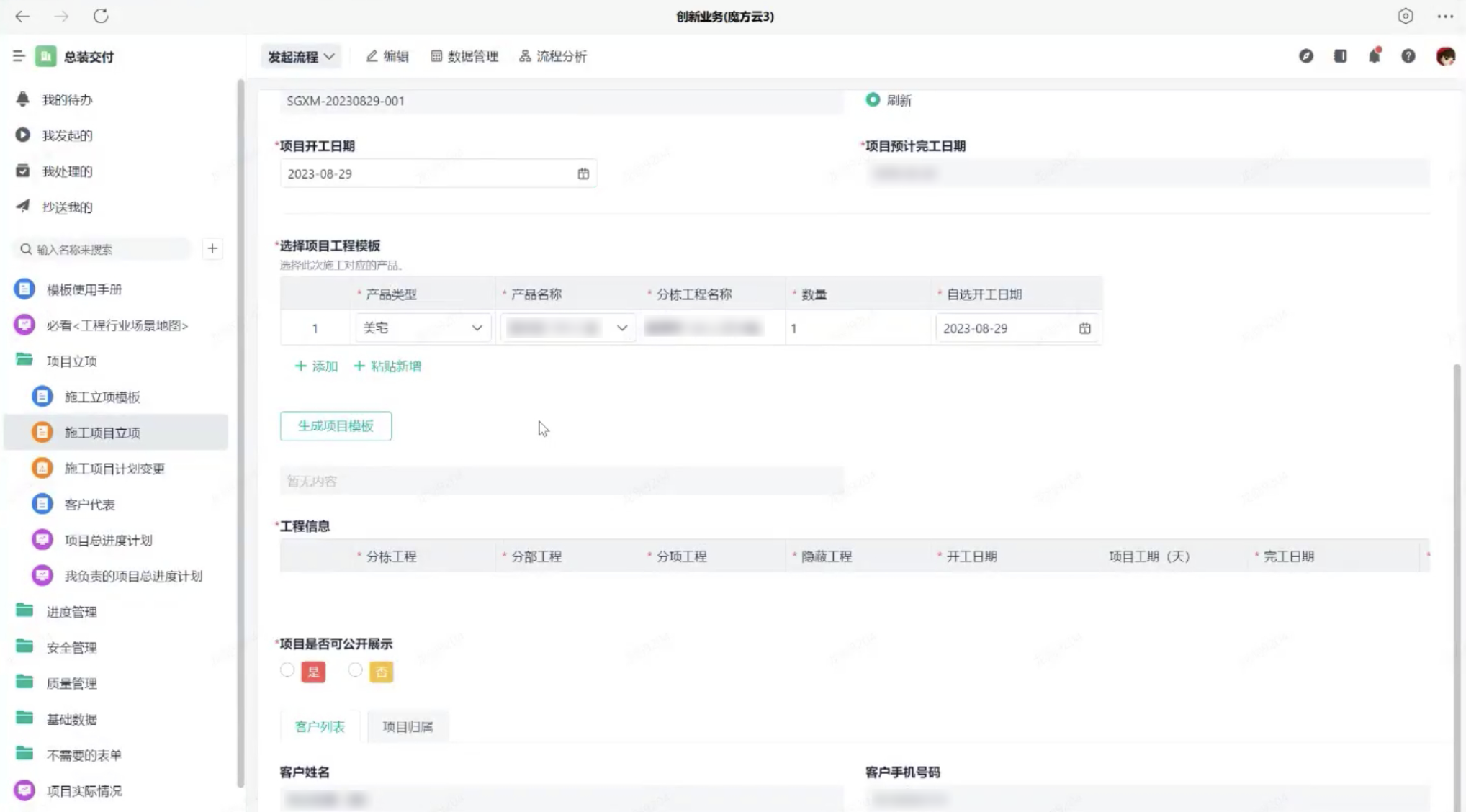 和普通商品不同,盖房子需要较长的项目周期,因此在CRM中,远大魔方把每一个潜在客户,都当做项目进行管理,通过在流程中设计《项目报备表单》,记录客户意向、项目地址、联系方式等信息。