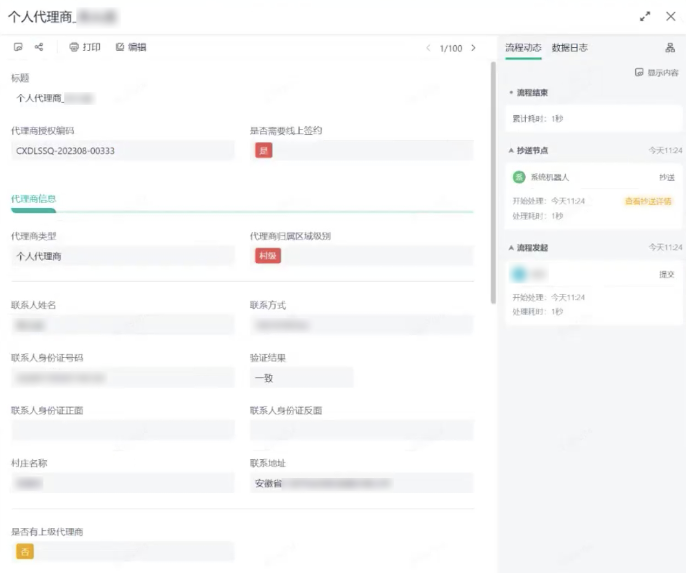 为了提高签约效率,远大魔方在应用设计阶段预设了代理商的三类不同资质水平情况,针对性地设计了三个审批签约通道,形成标准化的跨部门流程。设计代理商入库表单时,远大魔方做了身份、地区、是否有上级代理商等多重数据验证,系统根据验证结果选择相应通道,自动向代理商推送电子合同模板。