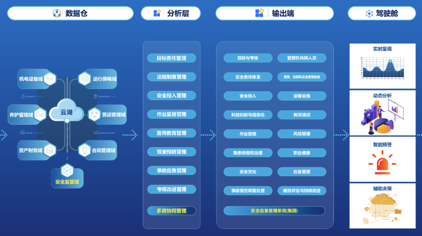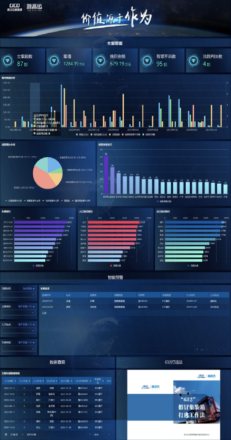 公司各业务板块根据工作需要,搭建了不同主题、个性化的管理看板,管理人员可以通过数字驾驶舱开展全业务数据的深入分析与研究,精准识别各环节的效能瓶颈与增长潜力,制定改进措施和战略优化方案,进而实现资源的最优化配置与业务流程的持续迭代升级。如:管理中心契约化目标看板、“数智安监”主题看板等,集成了浙高运公司上万张工作报表的生产数据,通过对各大业务板块运营态势感知和分析预测,赋能运营管理,包括安全管理、目标管理、绩效核算,无论是任何部门,都能找到契合使用场景的数据驱动解决方案。