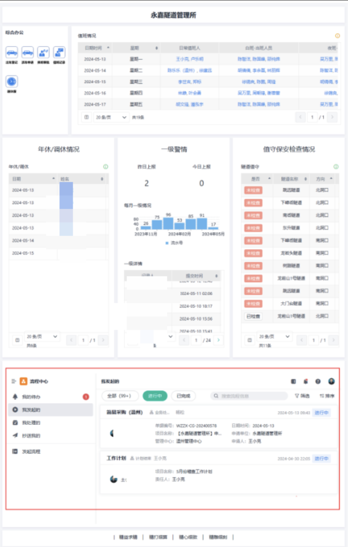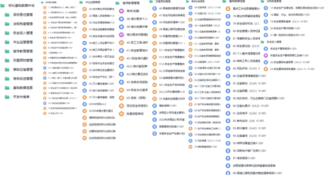 通过简道云的1个多跨协同模块+8个安全业务模块(目标责任、法规制度、安全投入、作业监督、宣传教育、双重预防、事故应急、考核改进)的形式组成安全生产标准化工作台。工作台由106个表单(其中流程表单56个,基层表单50个)和9个看板组成,实现“公司-管理中心-基层单位”3个层级安标化台账线上输入和输出,日均数据量6万余条。