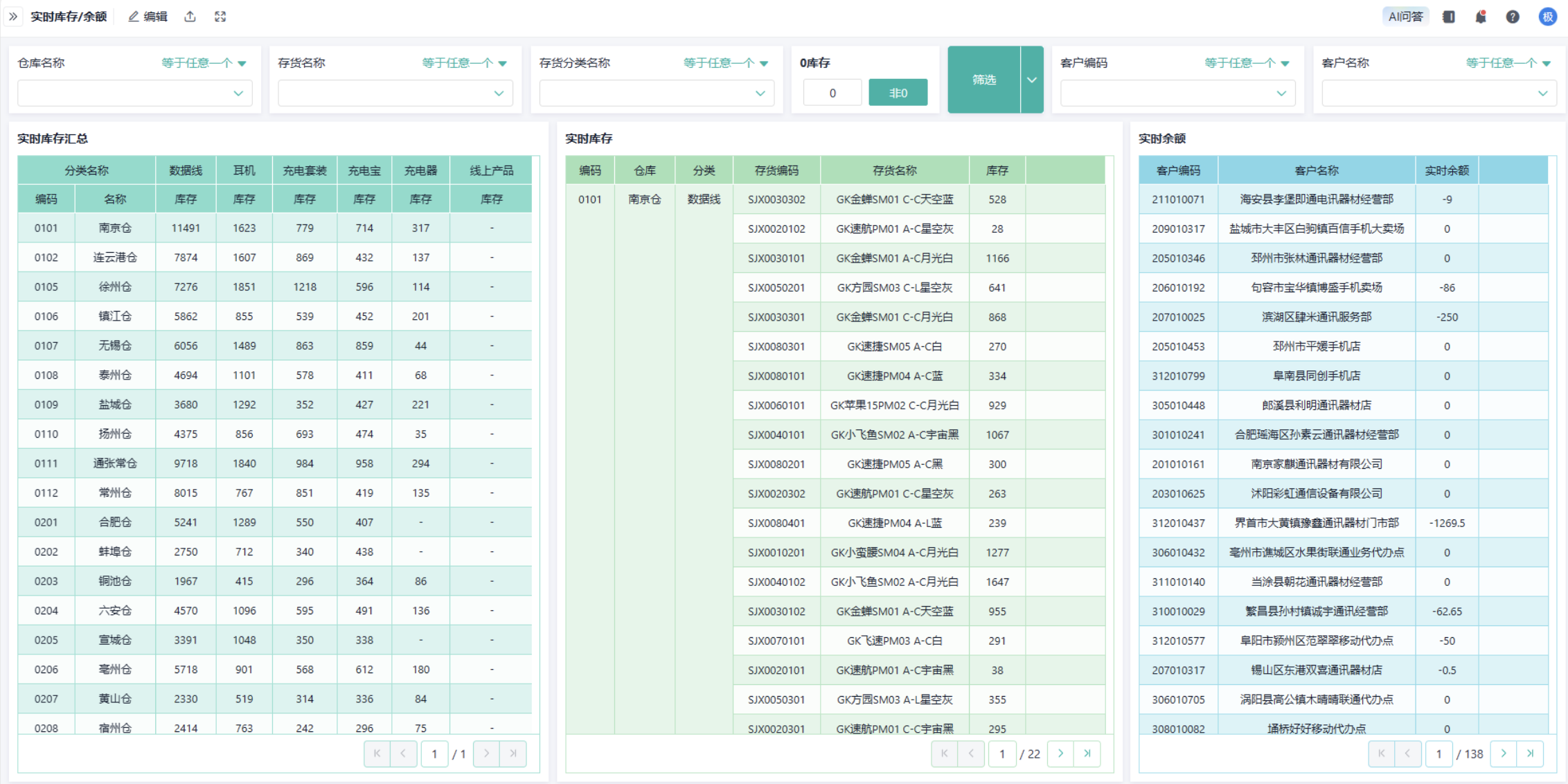 2)进销存数据和客户余额数据的实时展现