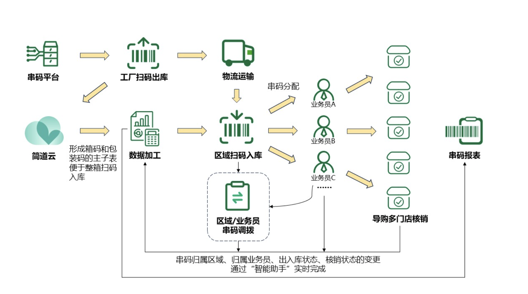 对于货品进销存各环节的意义,串码管理系统可以实现以下作用: