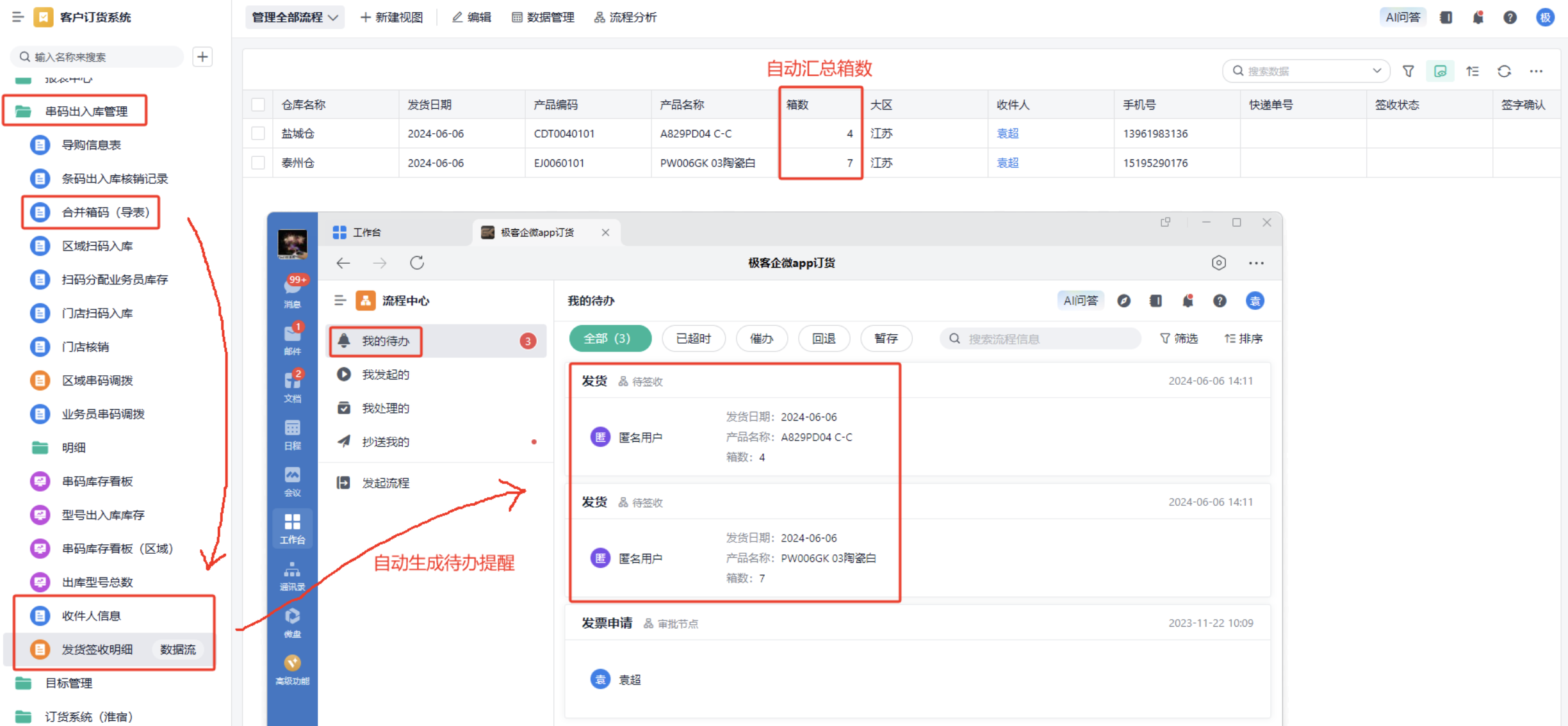 2、数据时效性存在滞后:很多时候因为实际业务场景的复杂性,一环套一环的,如果一步没有操作则会影响其他环节,有些时候业务员手头有事可能就忘记上报收发货情况了,导致遇到问题才想起来,某个环节的数据没有跟进,时效性是存在滞后的。例如:实际收发货,工厂库管按照以上流程到了主子表合并的明细串码后,还需要人为再汇总一份苏皖27个区域的明细,匹配收件人、收件地址等信息,还要将之后的物流单号回传告知到当地,这一系列放在微信群里做,那就太混乱了。往往工厂发了什么,发了多少的消息不能第一时间触达每个收件人,群里消息一多就会漏看,直到到货时才清点数量,这时再去回看群消息确认,来来回回效率非常低。