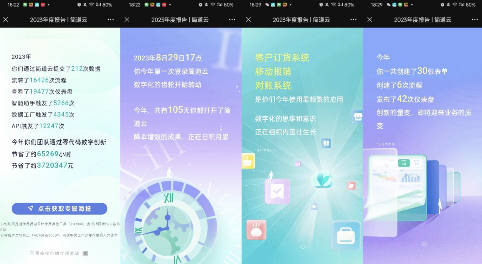 极客智芯这大半年用简道云运转下来,最深的感触就是,前期能把业务分析透彻,每个业务环节之间的关联性,每份数据千丝万缕的关系理清楚,那才能结合智能助手、数据工厂发挥出最大的效果,每一张仪表盘都是数据的精华所在。运行这大半年始终能做到简道云和金蝶数据一致,非常难能可贵,真的减少太多人力反复制单,反复核对校验的工作。以下是当时使用了三个多月时候的年度报告,“小投入,大回报”个人角度来说已经挺满意的了,能为新公司带来这些效果,很是欣慰!