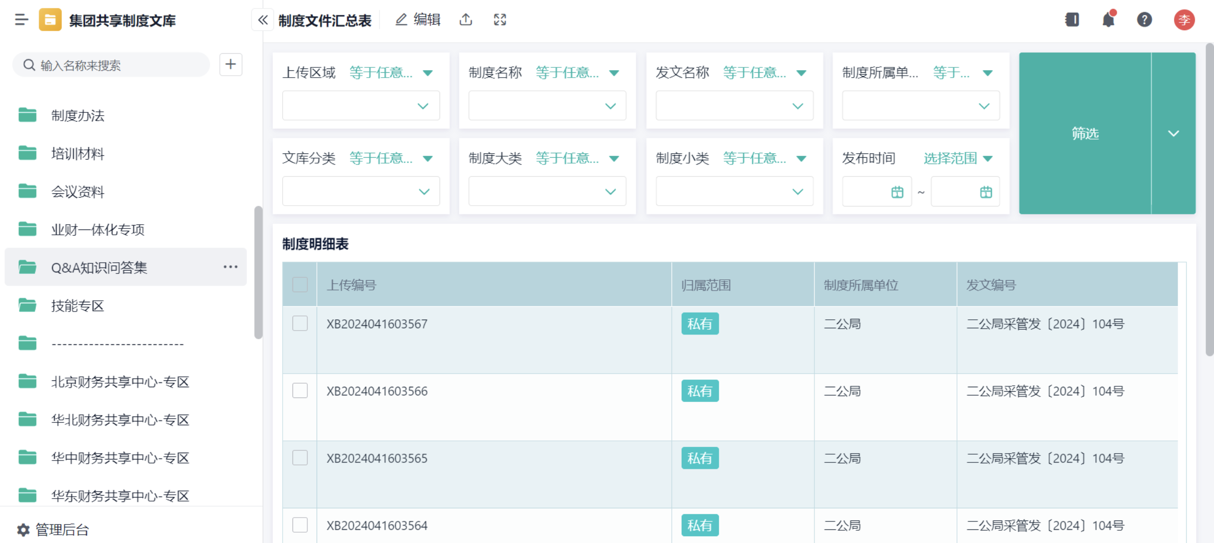 针对中交财务共享中心管理特点、围绕制度管理需求、基于简道云搭建制度文库系统,实现了分中心、分部门多级管理制度等各类文件。