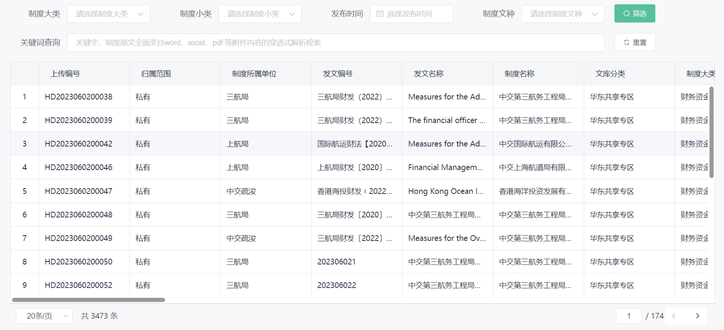 中交财务共享中心制度文库系统合理设计了多维度文档分组,用户不仅可以通过内容主题、文档题材、各类专项进行检索查阅,还可按照制度发布来源、所属单位开展分类学习,能够使财务共享中心人员快速定位制度、资料位置,便捷进行查询阅览,除此之外,制度文库系统已具备全文检索功能,从多维度、多范围优化制度文件检索途径,极大提升财务共享中心人员查询效率以及制度管理质量。