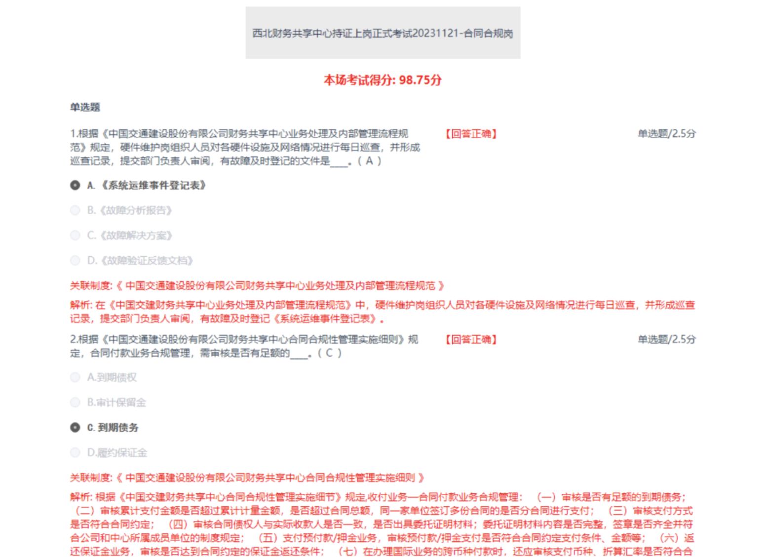 中交财务共享中心制度文库系统提供了系统性的制度解读、学习、考试测评功能,使中心内可便捷开展与制度相关的各类培训或宣贯,能够快捷发起相关的各类考试测评。同时,员工可以通过在线考试来检验自己的学习成果,通过系统在每次测评考试后自动生成的考试成绩和反馈报告,帮助员工查漏补缺,了解自身学习的短板及遗漏之处,切实提高共享中心人员对制度的深入理解能力与实际应用能力。