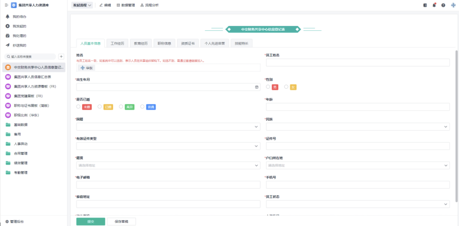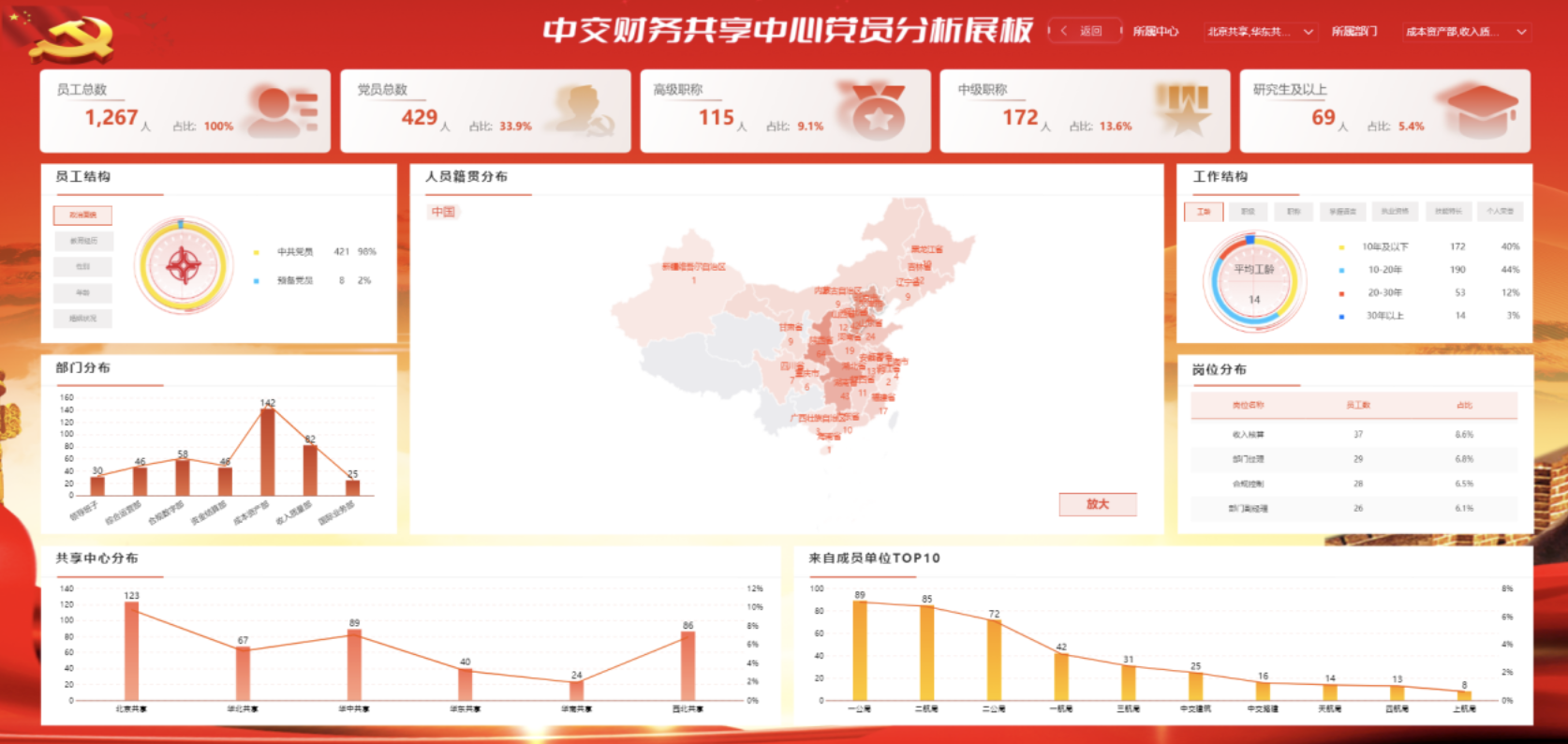 搭建中交财务共享中心人员信息登记表,设置基本信息、工作经历、教育经历、职称信息、资质证书、个人先进荣誉、技能特长7个页签,通过导入的方式将已有信息导入。权限上设置集团级、人资专员、员工级三类权限,员工可自主更新自己的数据。基于人力资源库数据利用FineReport形成人资展板和党建展板,实现人力资源情况可视化。