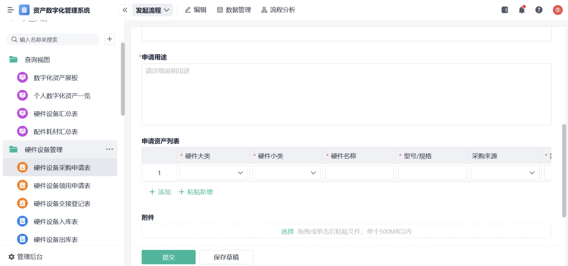 参照进销存流程,将采购、到货、入库等环节融入资产管理中,形成可追溯的资产管理流程,完善资产管理体系。