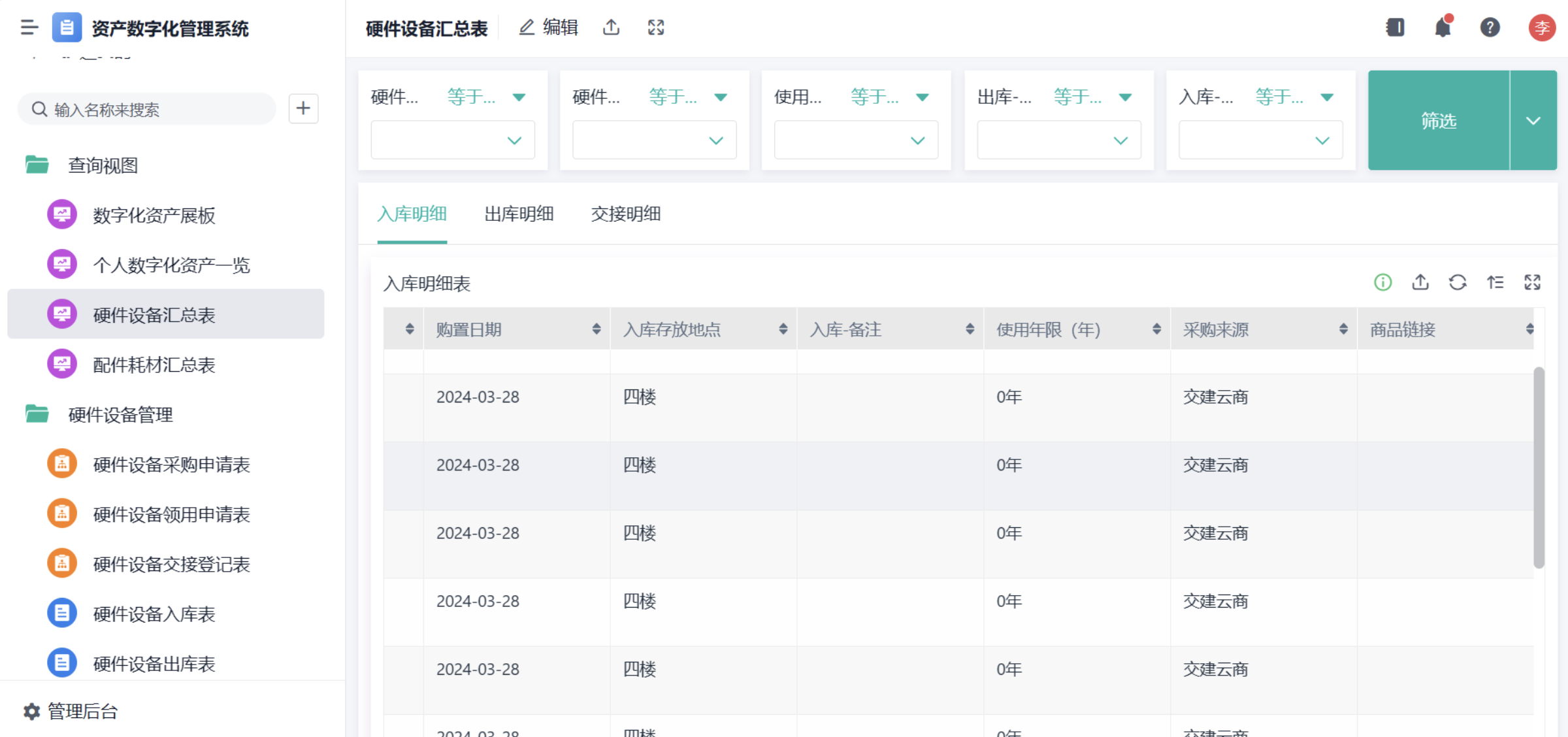 以交建云服务器为基础设施,基于简道云平台搭建资产管理数字化系统,该系统分为硬件设备、配件耗材两部分,系统功能包含基础的采购、入库、领用外,具备可视化资产查询,以实时掌握中心硬件和配件情况,监控资产状态,优化资源配置,提高管理效率。