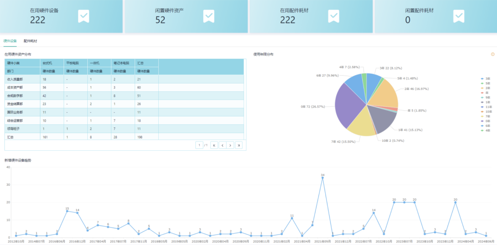 通过资产数字化管理系统的可视化查询功能,可清楚了解每个资产的库存,以及使用年限等,便于管理人员及时补充、更换、重新利用及淘汰资产等,提高资产利用率,从而优化资产配置。