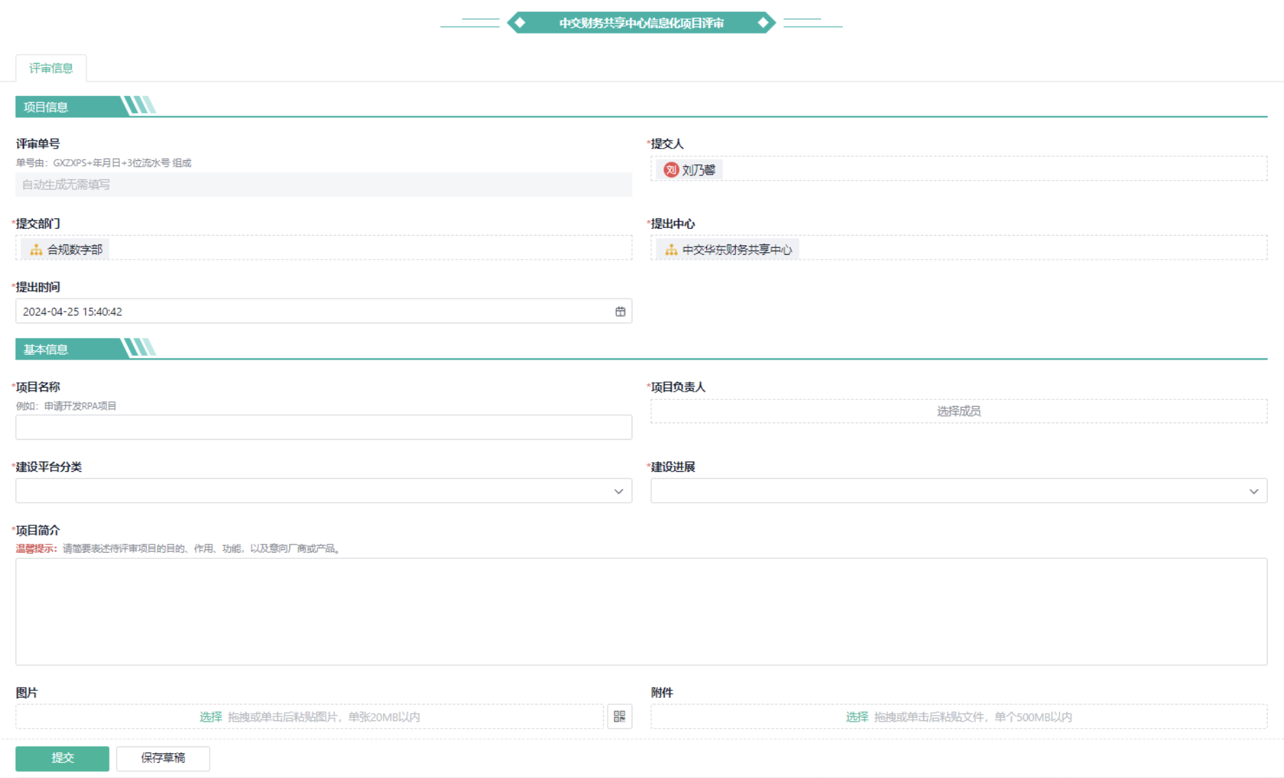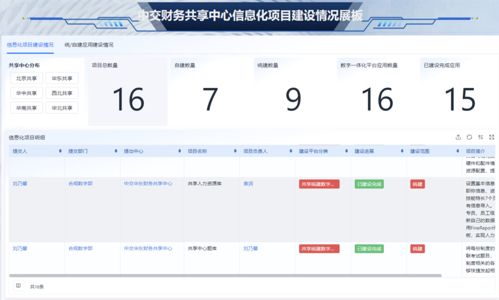 信息化项目评审管理:通过流程表单评审中交财务共享中心在不同领域的创新项目,避免成本重复投入造成资源浪费。同时,形成可视化展板定期展示项目建设数量及进度,公示统/自建应用的相关内容(应用名称、建设平台、发布平台、是否纳入信科交建云、安全等级等)