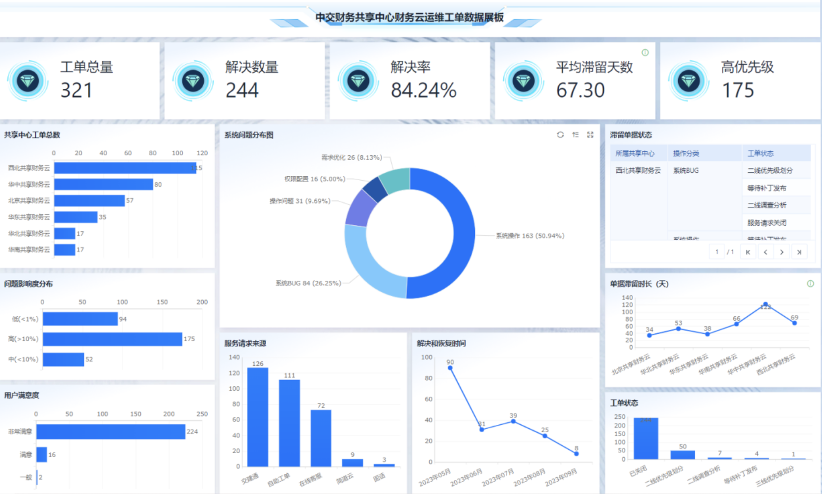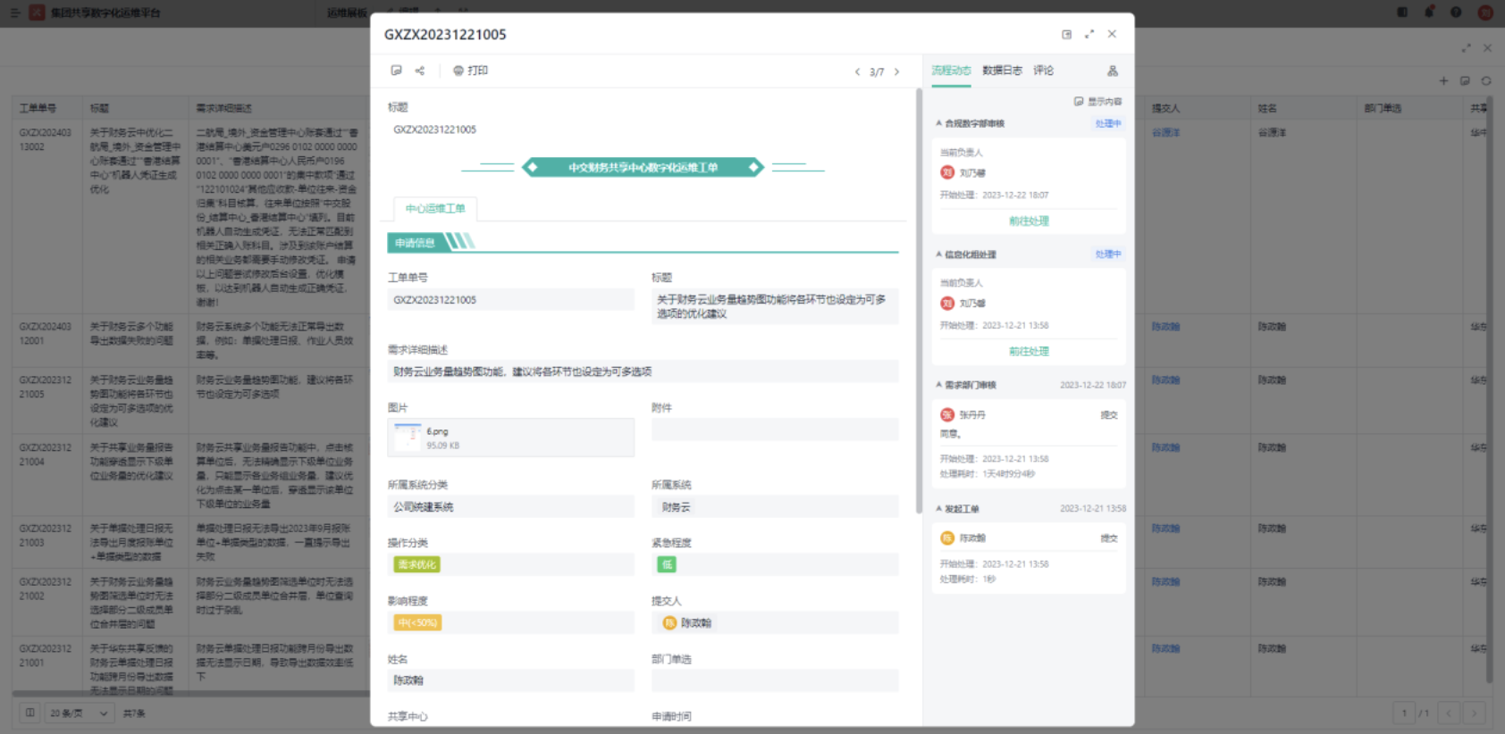 运维工单管理:①可进行公司统建、中心统建、区域自建系统的运维请求工单登记、处理、汇总统计。②可进行公司核心系统的需求管理,提供会签评审功能,评审通过后对接集团工单,实现财务云需求全过程跟踪处理。