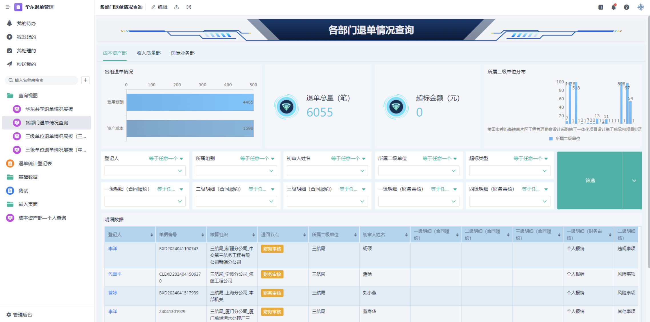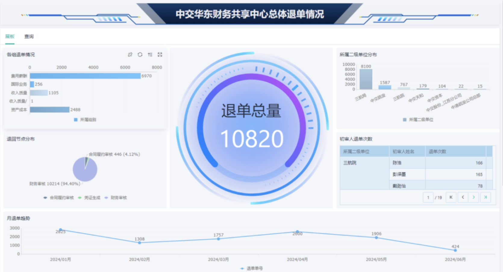 平台具备直观的可视化展板。通过共享中心业务质量展板和部门业务质量展板,各部门可以清晰地看到退单量、所属二级单位分布华东共享及成员单位的退单占比、退单原因、退单趋势等。通过成员单位专项展板,能为成员单位展示各节点退单明细、核算组织分布等关键指标,有助于他们快速了解退单情况,及时发现潜在问题,并作出相应的决策。目前已为2家大体量成员单位定制业务质量展板,展示10余家三级单位质量情况。