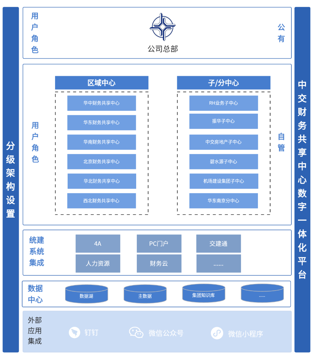 中交财务共享中心作为集团新成立的管理机构,在数字化建设方面,除统一应用财务云等业务系统进行核心业务处理外,六大区域中心原有内部管理、分析的信息化工具互不相同,由此产生的应用需求如下: