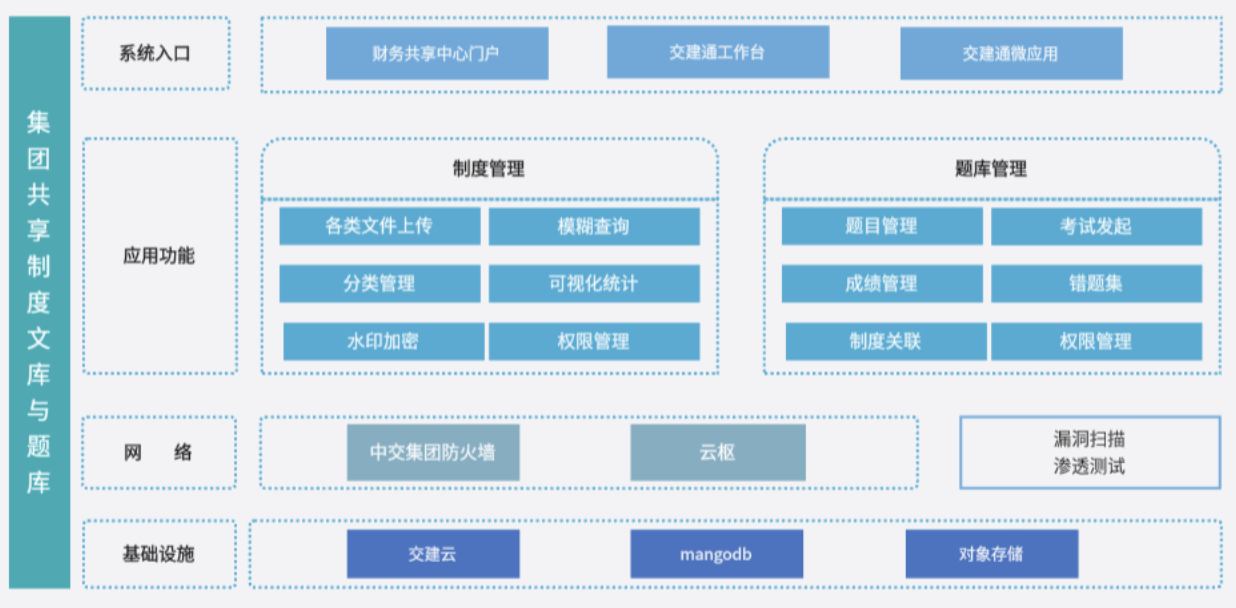 集团共享制度文库与题库将交建云服务器资源、麒麟操作系统作为底层支持,采用K8S容器部署,使用中交集团二级域名并且加入中交集团网络安全防护体系,在保证系统易用性的前提下提高系统的可维护性与安全性。