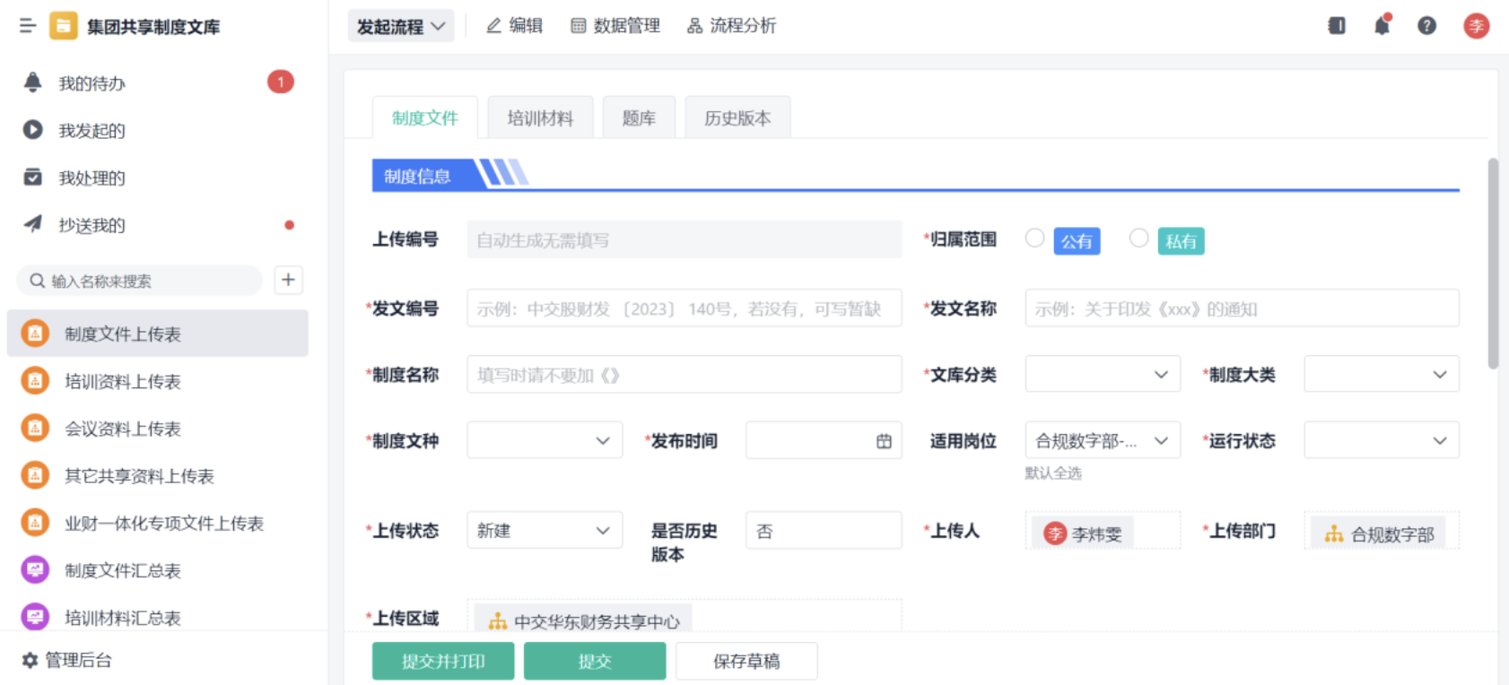 制度文库系统共包含32个表单,344个仪表盘,由内部团队完成应用框架搭建,总计耗时2个月,相比传统系统开发,节约了开发时间20天,节省成本7.5万元,目前系统内共上传制度3473份。