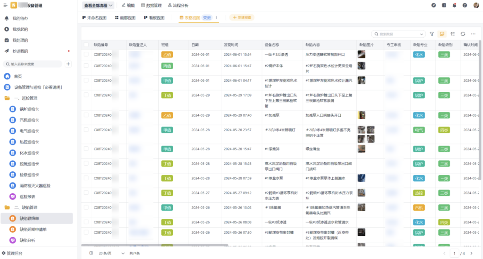 3.建立自动化检修流程:对于巡检异常或故障,通过巡检单简道云智能助手,自动化触发“缺陷通知单”,并且仪表盘的预警功能通知相应人员。为电厂安全稳定运行提供了有力保障。