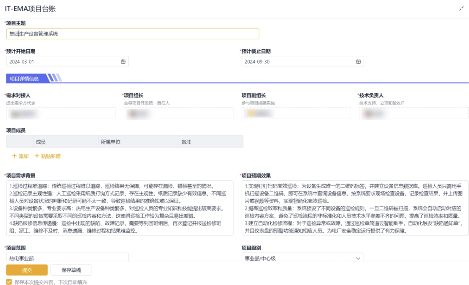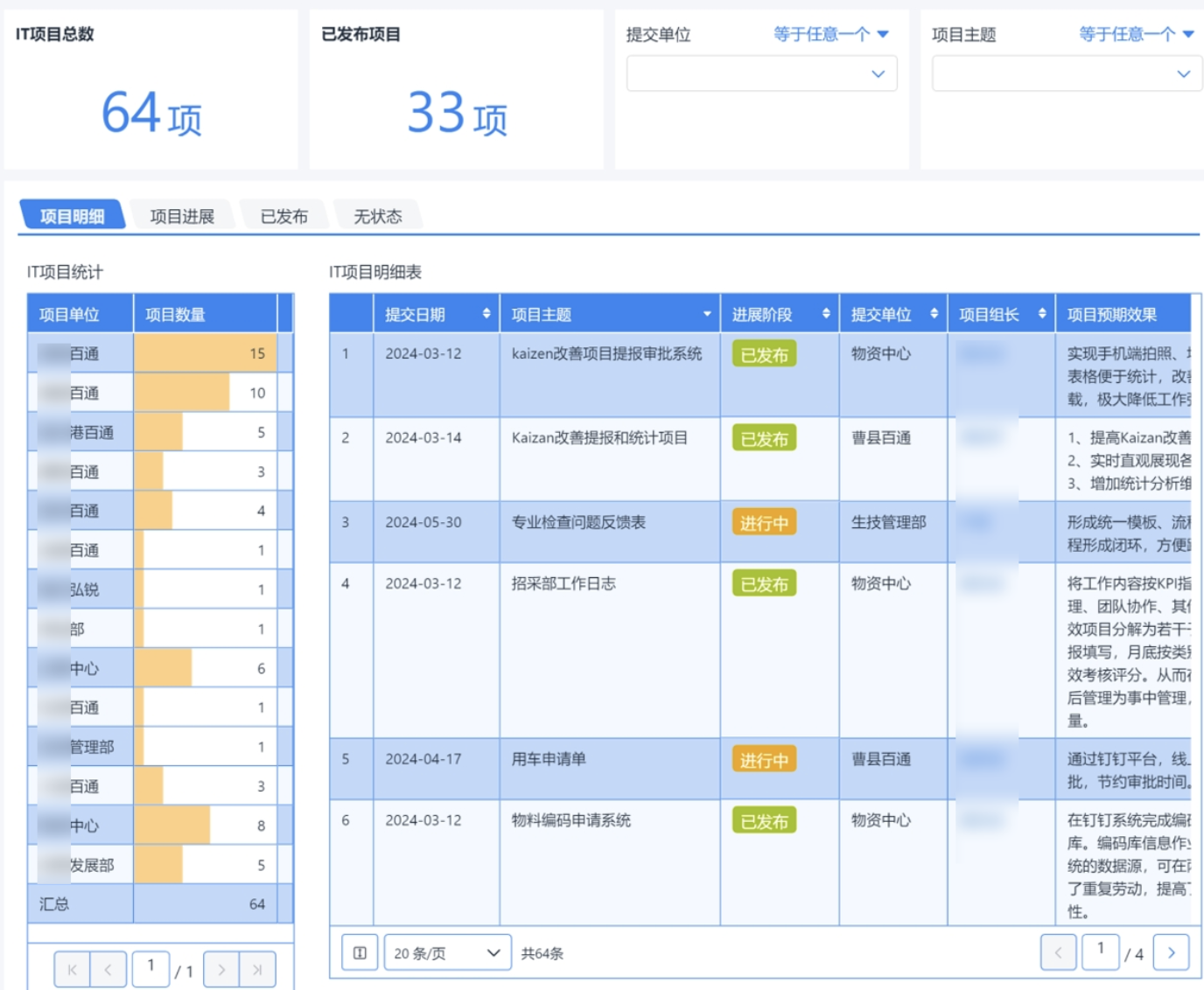 通过培训简道云60名子管理员,大家踊跃搭建自己所面对场景的应用,应用数量快速攀升。为了保证流程秩序和数据安全,公司建立IT-EMA项目工作台,所有信息化项目进行报备,明确项目业务对接人、项目负责人和技术负责人,项目分层分级管理,小组中的项目负责人对功能把关,技术负责人对项目技术把关,确保项目有序开展。