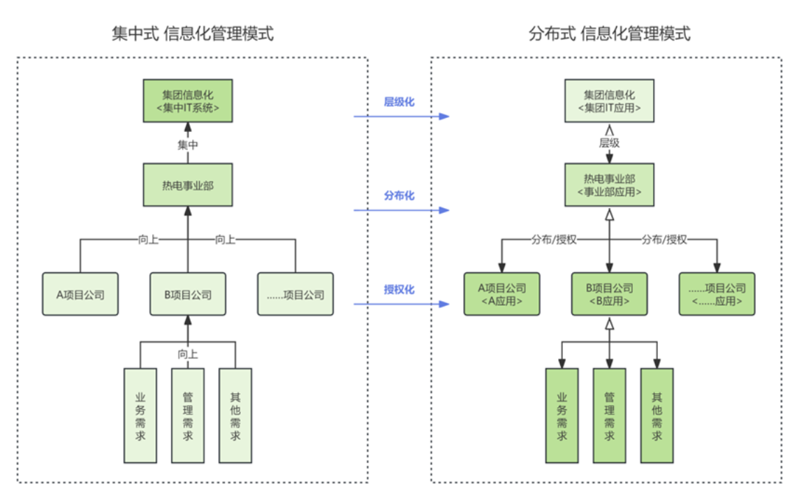 经过分析,集团公司(位于北京)与项目公司分布于不同地域,信息化部门显然难以有效掌握所有项目公司不同的业务需求场景。因此,信息化部推动“集中化”向“分布式、层级式、授权式”发展,由总部授权下属子公司自主进行业务应用开发,让信息化系统更贴近业务场景,服务业务现场。