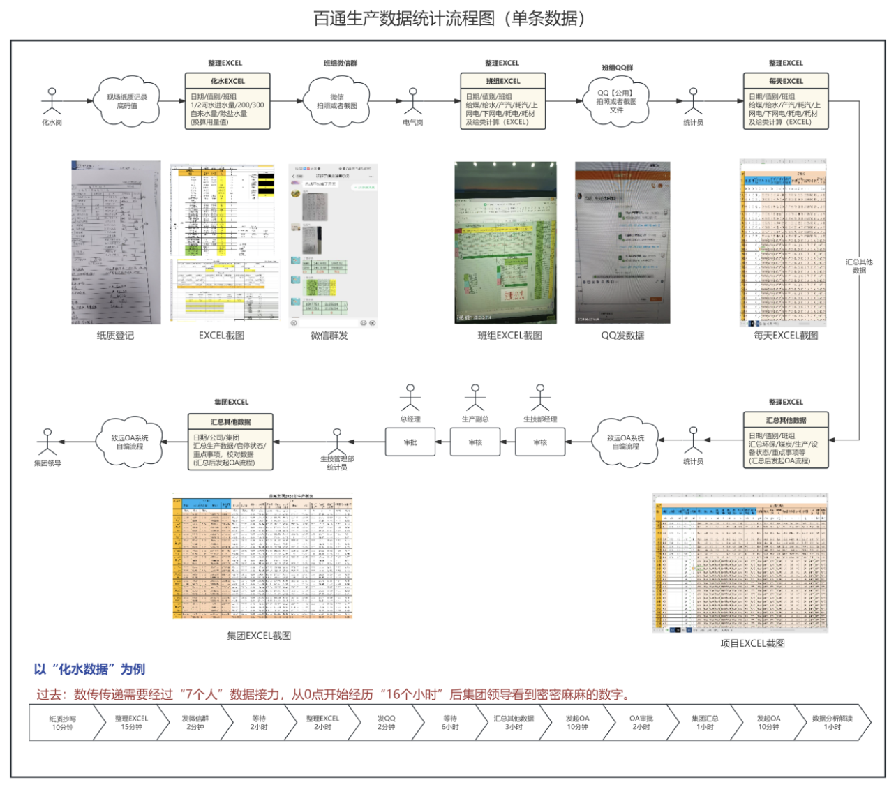 1.数据填报更新周期长:过去从运行岗位第一次填写数据,需要经过值长、统计员、生技部经理、生产副总、项目公司总经理,再经过集团生技管理部汇总后才能到达集团领导。次日下午16点后才能拿到前一天的生产数据,单向数据提报需要16小时。每天有9名数据统计员和30名部门管理者参与数据核对和审批。