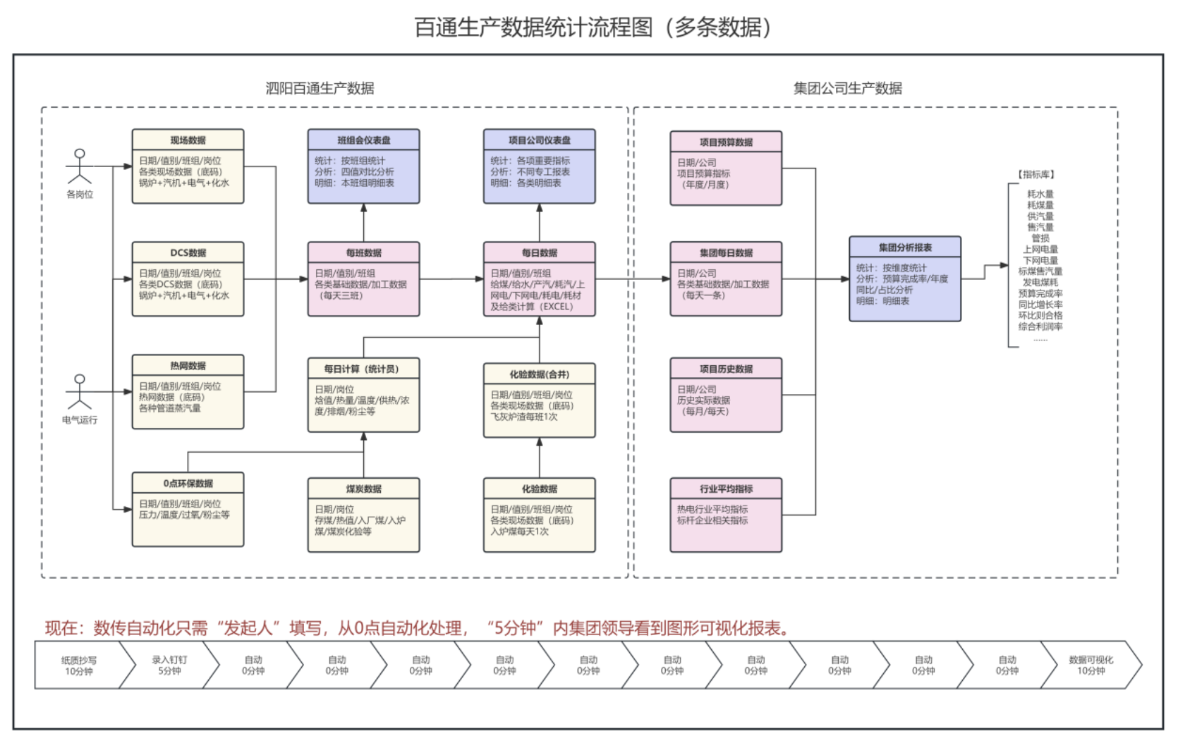 热电是流程工业,24小时四班三倒不间断生产,至少每8小时生成1次班组数据,每天单岗位要生产3次数据。这些数据需要次日汇总后报集团,再有集团汇总8家项目公司数据后制作集团生产数据报表,于次日下午16点报集团领导,在这过程中出现了以下痛点: