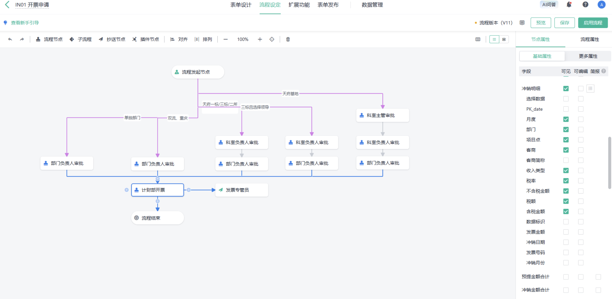 发票管理各项子业务的开展总体都比较混乱,首先便是梳理业务流程体系,理清存在几个业务场景,每种场景涉及多少环节,每个环节的参与人有哪些,为后续在简道云设计表单、流程、逻辑等打好基础。