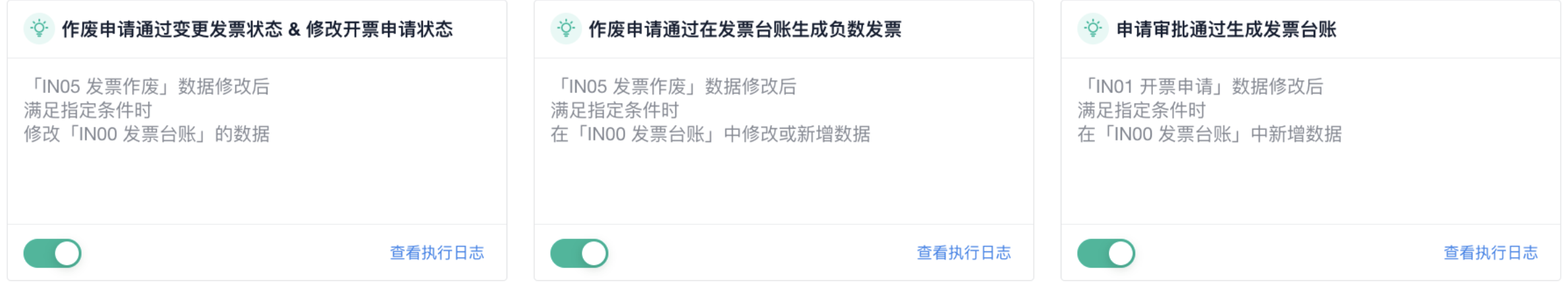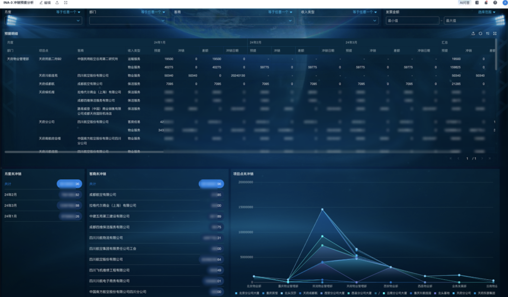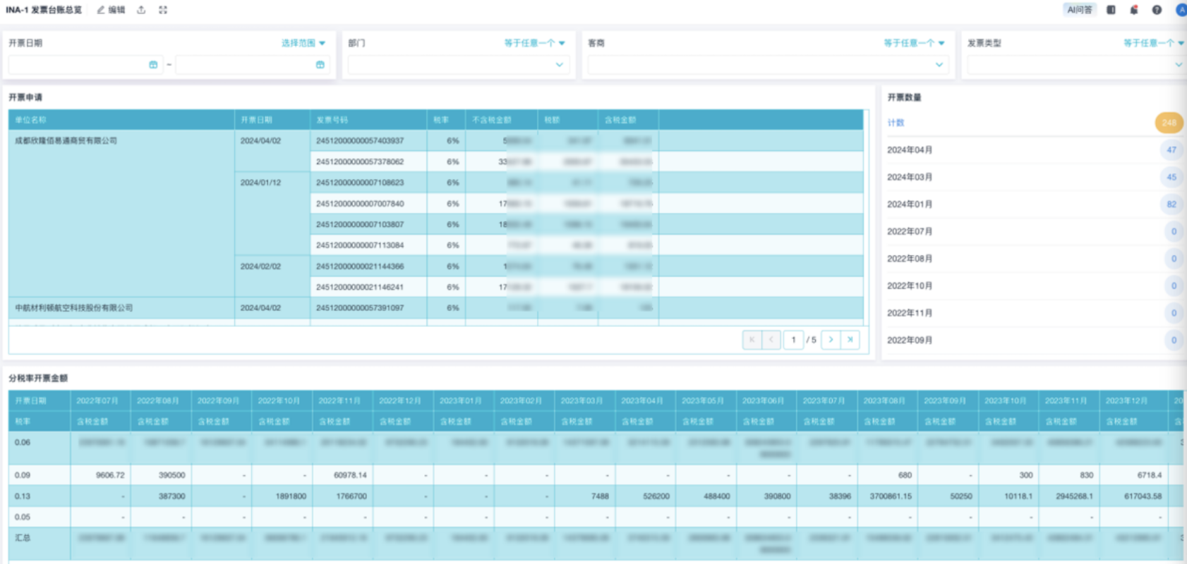 - 设立各类仪表盘,可以根据不同筛选条件查看全部发票状态、开票数量、作废发票数量,并且能够更好的实时把控业务前端环节预提冲销动态。