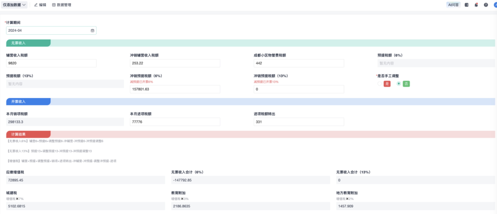 - 每月月初,财务人员在【税费计算】表单,选择计算期间后,通过MAPX跨表单取数功能根据前序设置的PK值及其他规则自动计算数据,财务人员核对确认后生成最终税费数据打印留档。