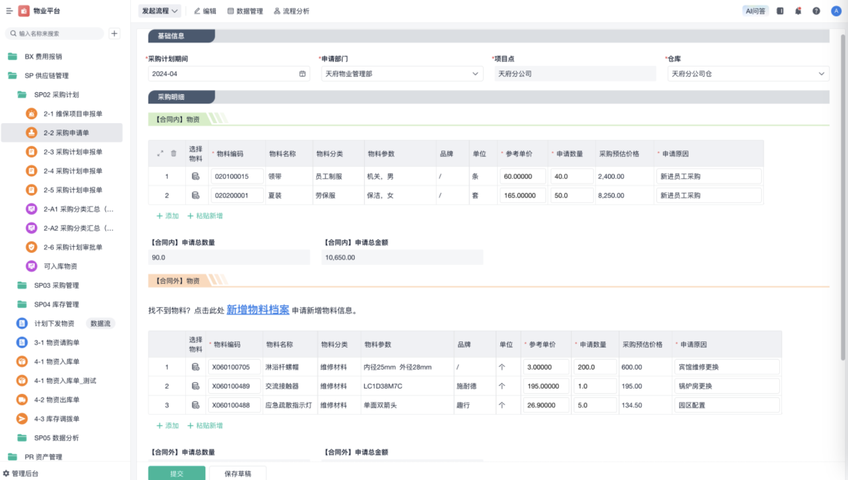 在此阶段,补足缺失的业务环节,从采购计划申报、审批,计划下发,请购单发起,采购订单发起,送货单,到货验收单,入库单,出库单,实现全业务线上运行。