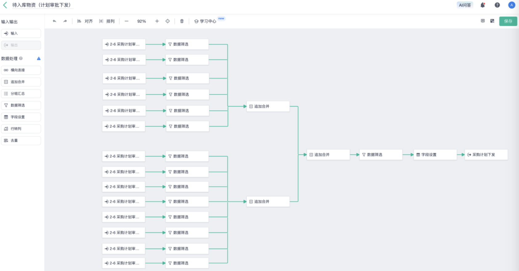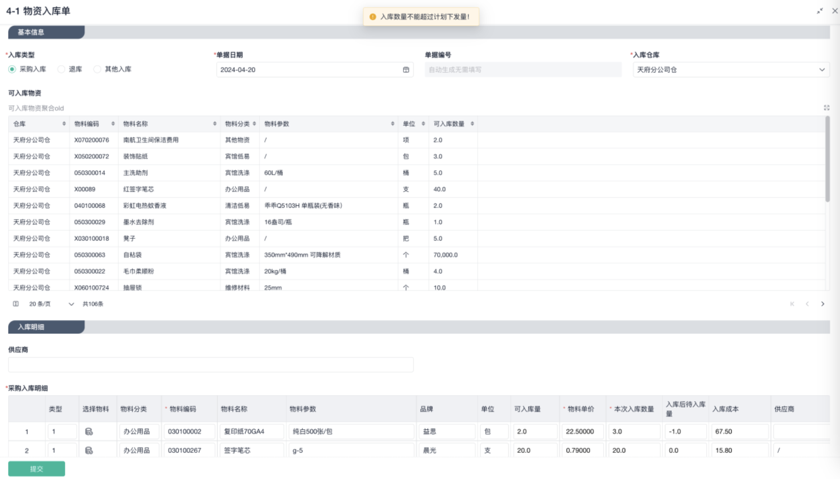 - 定义【采购计划申报单】和【采购计划审批单】,让生产部门计划专员和公司总计划管理员进行采购计划的申报、审批管理。设置物料的所有信息仅能通过唯一的编码来选取,规避了档案人为填写的各类问题,最终由总计划管理员直接参选拉取各部门计划数据,核准后发起审批流程,审批完成后通过预制的打印模板输出存档。同时,采购计划审批完成后通过“数据工厂”功能,整理计划中所有物资信息为一张总数据表,将输出结果自动同步至表单【计划下发物资】,用于后续控制入库物资数量。