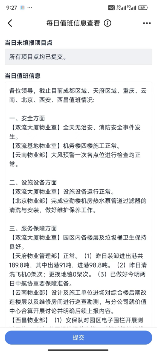 公司每日都会安排不同领导值班,值班领导需要在晚间和早晨两个时间点分别在微信群中报送当日总部和所有外站分子公司(分散全国各地)运行总体情况,为了更清晰的展示结果,报送的文字已经形成了标准化的格式。并且后续领导可以根据值班信息的记录在一周内申请补休假。