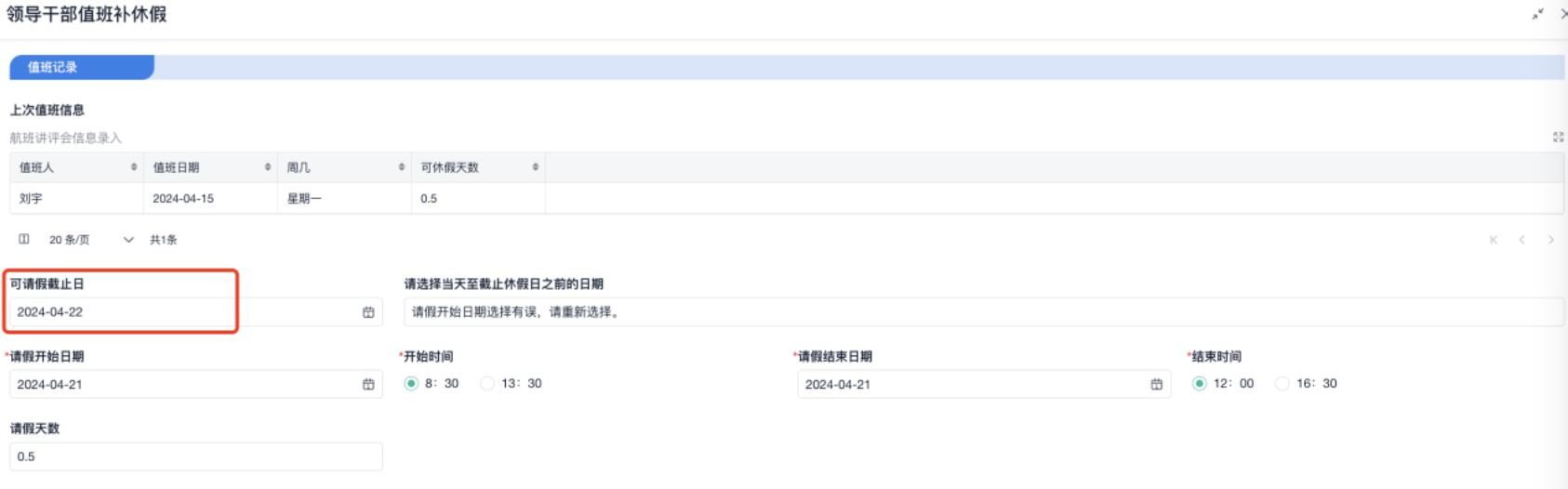 值班领导的请销假理论上需要限定值班后一周内,目前全部流程都是直接通过值班管理员口头传递信息,不但耗费时间,而且没有规范的记录。