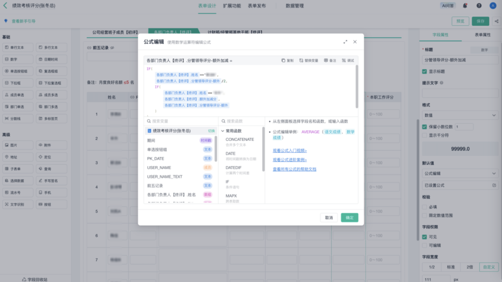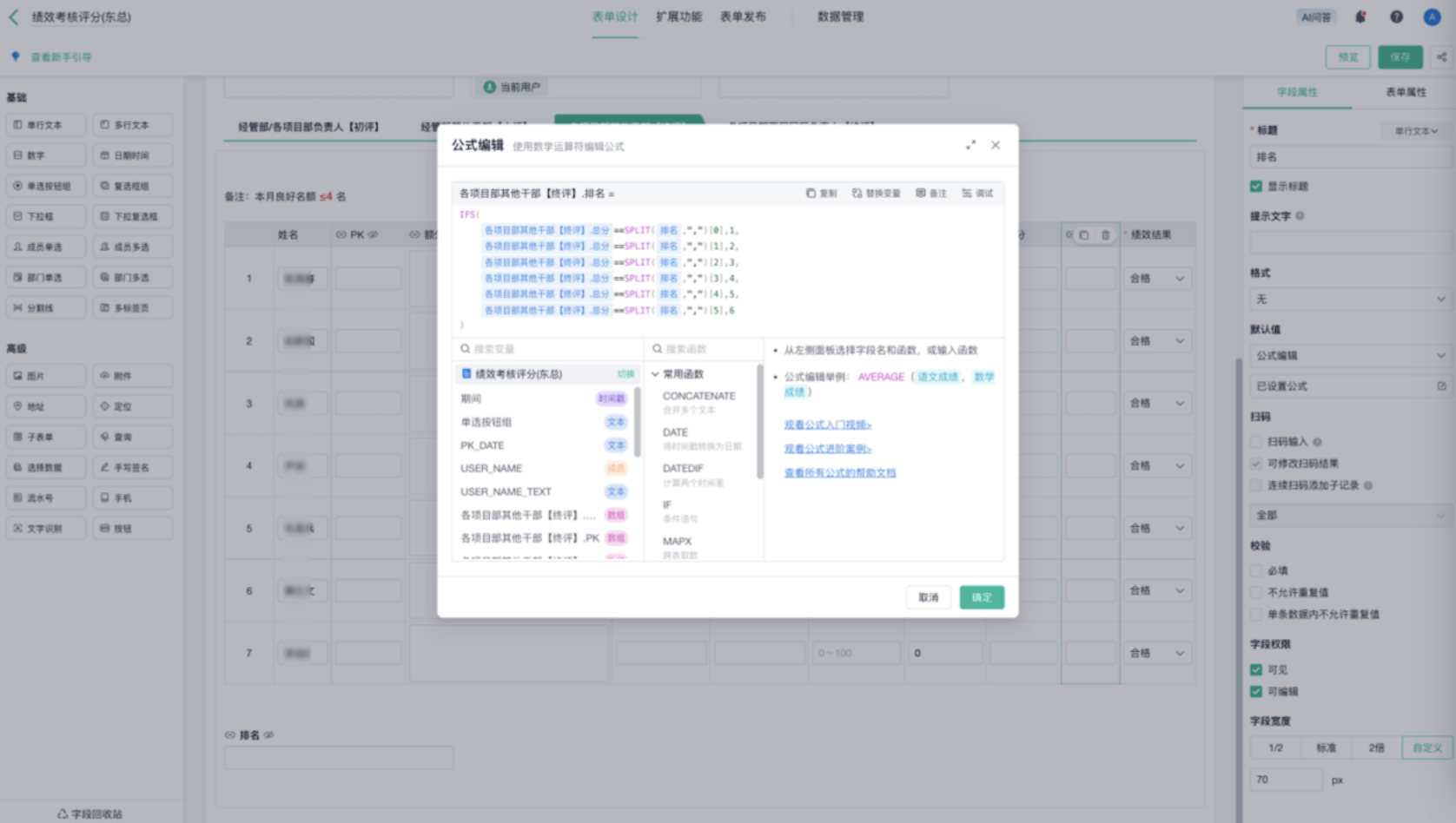 - 在领导评分表单中,重点是界面易用性的设置,能够预置的数据、数据的格式、表单的结构、配色、备注,并且通过公式设置前序评分的权重、人员的排名情况,方便领导直观查看结果。