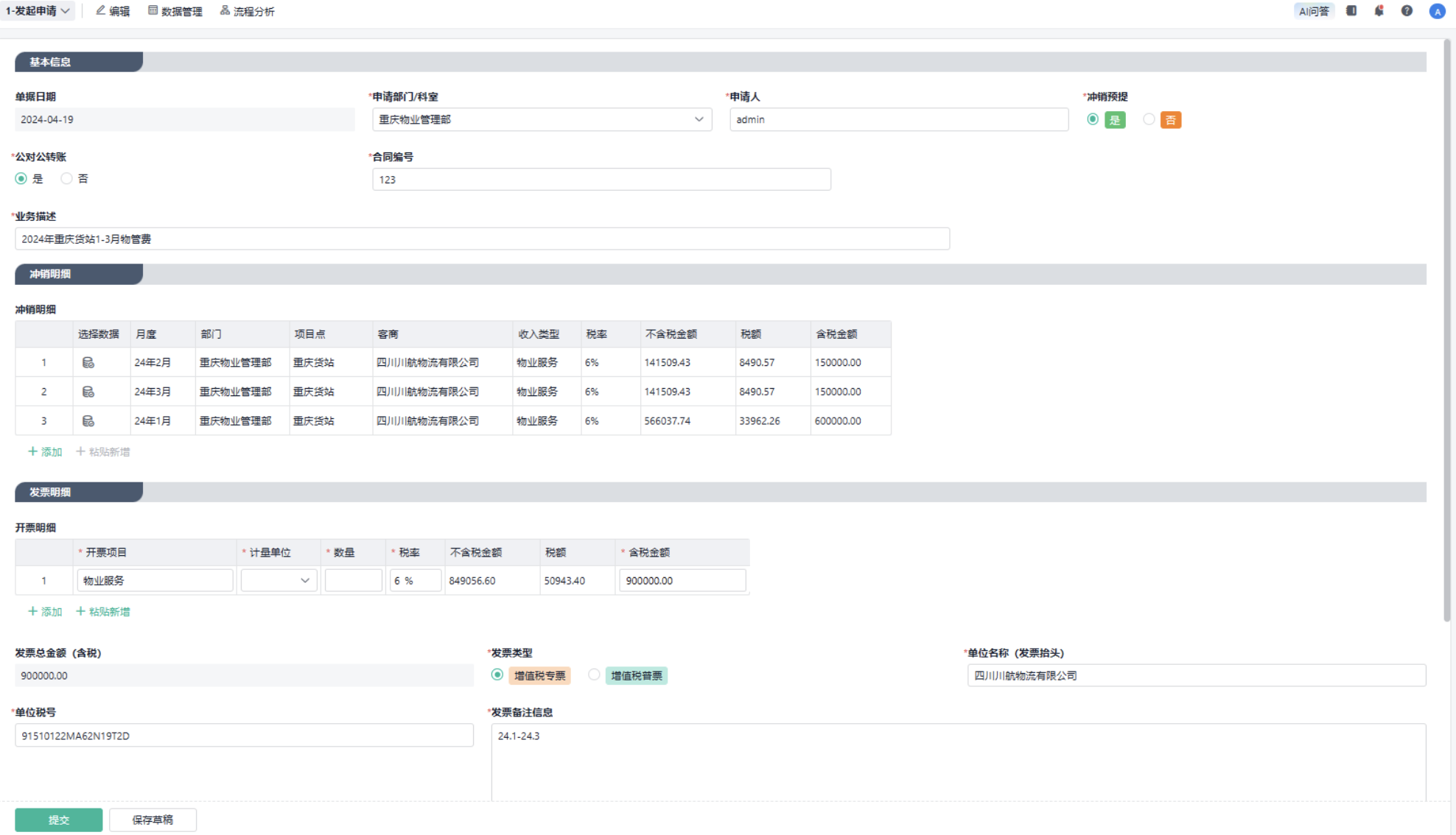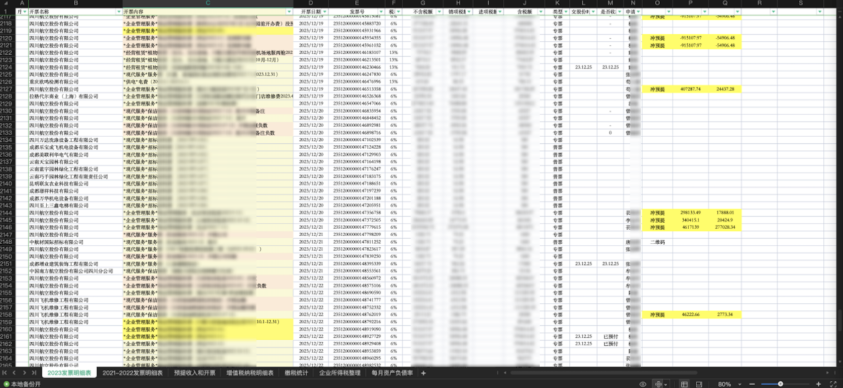 在开具发票之前,前序的业务环节是需要不同的生产部门预提每月收入数据,即预估当月可能发生的收入数,用于财务账务处理,每月核算公司收入数据。在预提收入后,根据业务实际发生情况(实际的费用结算周期)由不同部门相关业务人员向财务部发起开票申请,通过后财务人员通过税务平台直接开具发票(目前暂无业务系统进行对接直接开具发票),然后登记发票台账,用于每月企业增值税、所得税等计算。此外,因为每月预提收入后财务人员会缴纳当期增值税,所以需要定期核对业务部门预提数据与开票数据的匹配关系,以此为依据调整税额。