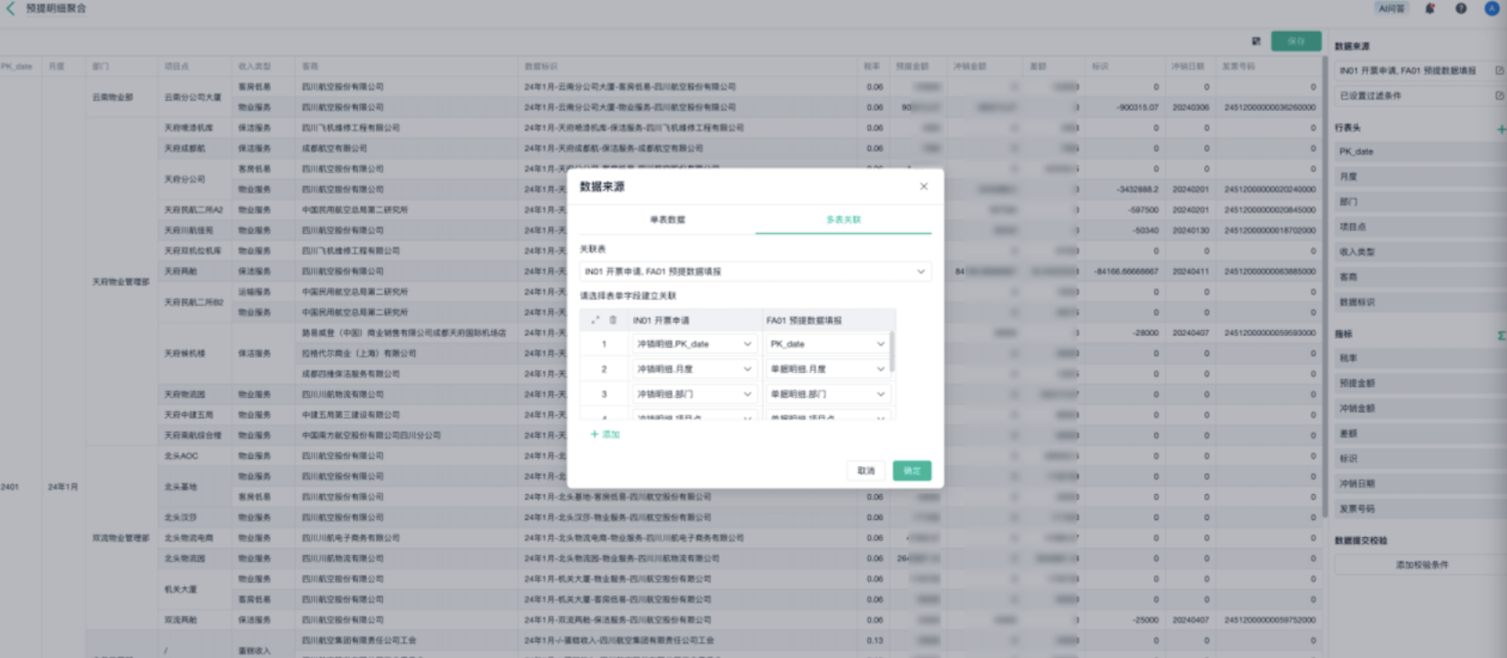 - 设定基础参考数据表,业务人员在【预提数据填报】表直接参选部门预提收入数据,进行核对确认提交,减少人为填报的工作量和差错率;业务人员在【开票申请】表单通过选择“冲销预提”,将前序填报的收入明细参选过来,后台通过简道云“聚合表”功能同步匹配预提数据和开票申请数据,形成勾稽关系匹配,计算实时冲销情况、余额、冲销日期等(由于聚合表不支持日期字段,此处日期变通处理为数字格式,例如2024年4月17日,即显示为20240417),同时再利用“数据联动”功能将前序预提数据填充至开票申请表单,简化业务人员操作;