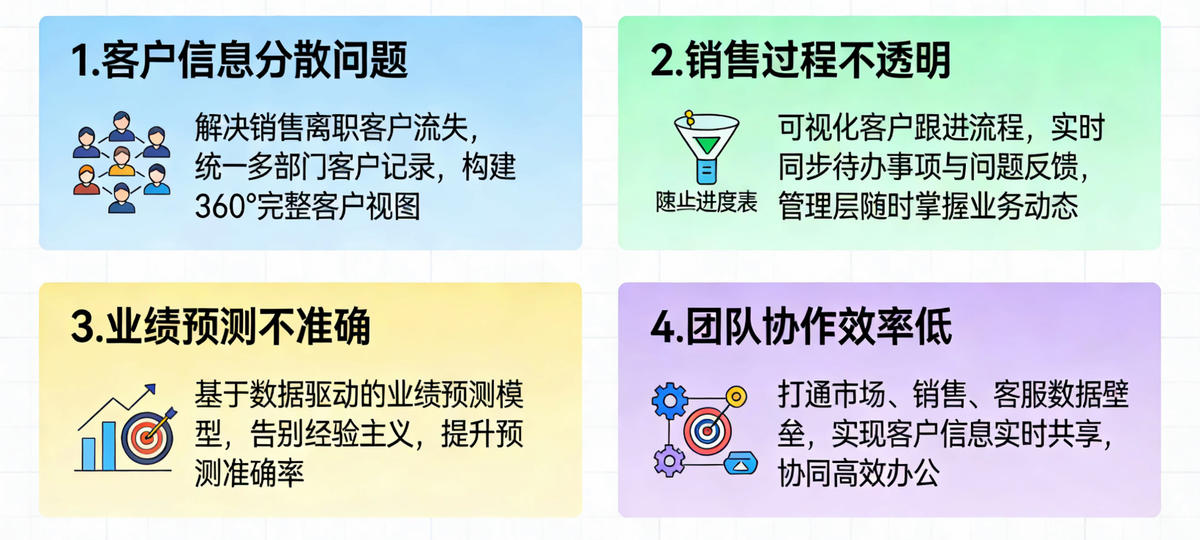 1、客户信息分散问题 销售离职带走客户资料,新同事接手要从零开始。同一客户在不同部门有不同记录,公司永远看不到完整客户画像。