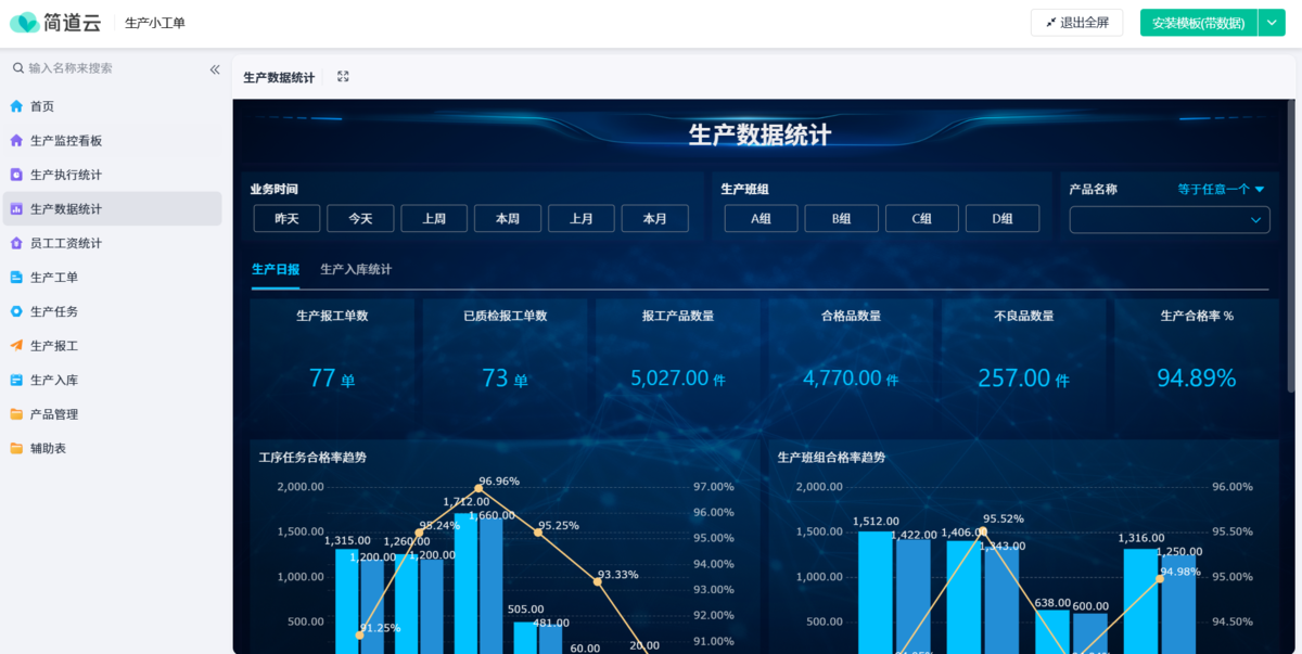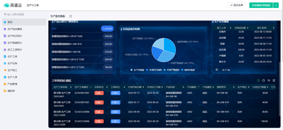 第六步:看数总结 所有工单干完了,系统自动就把数都算好了:订单完成了多少,生产效率怎么样,工时用了多少,一次合格率多少。管理层想看生产进度,不用打电话到处问,看系统里的看板就行。