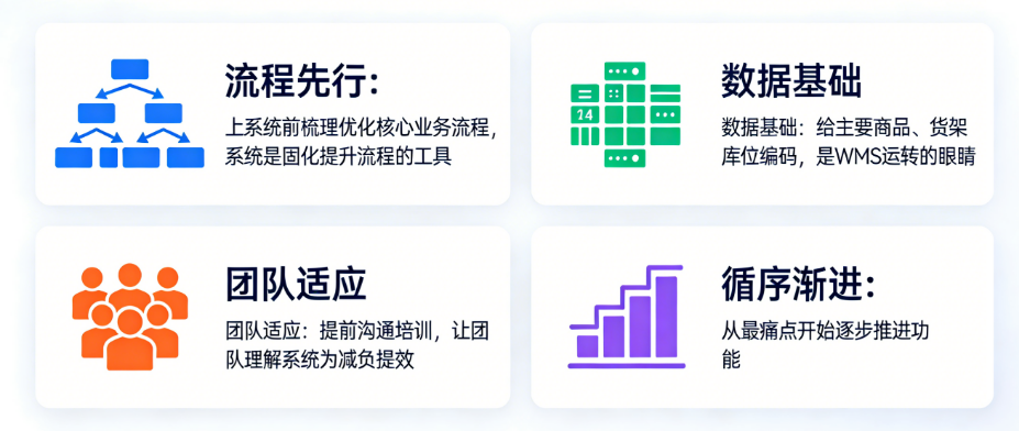 - 循序渐进:不必追求一步到位把所有功能都上了。可以从最痛的点开始,比如先管好入库和库存,再上拣货优化,逐步推进,让团队有个适应过程。