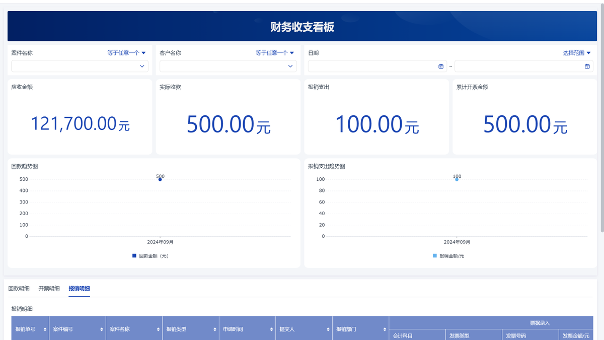 - 费用与报销账:差旅、招待等费用在线申请、审批,并与案件关联。员工报销方便,财务核对轻松。