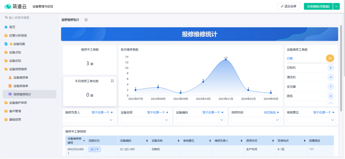 最大的好处是,数据全部打通了。 我在后台仪表盘就能看到:今天有多少点检异常、维修平均响应时间多长、哪些设备故障率高、备件消耗top10是哪些。做决策、写报告,都有实实在在的数据支撑。