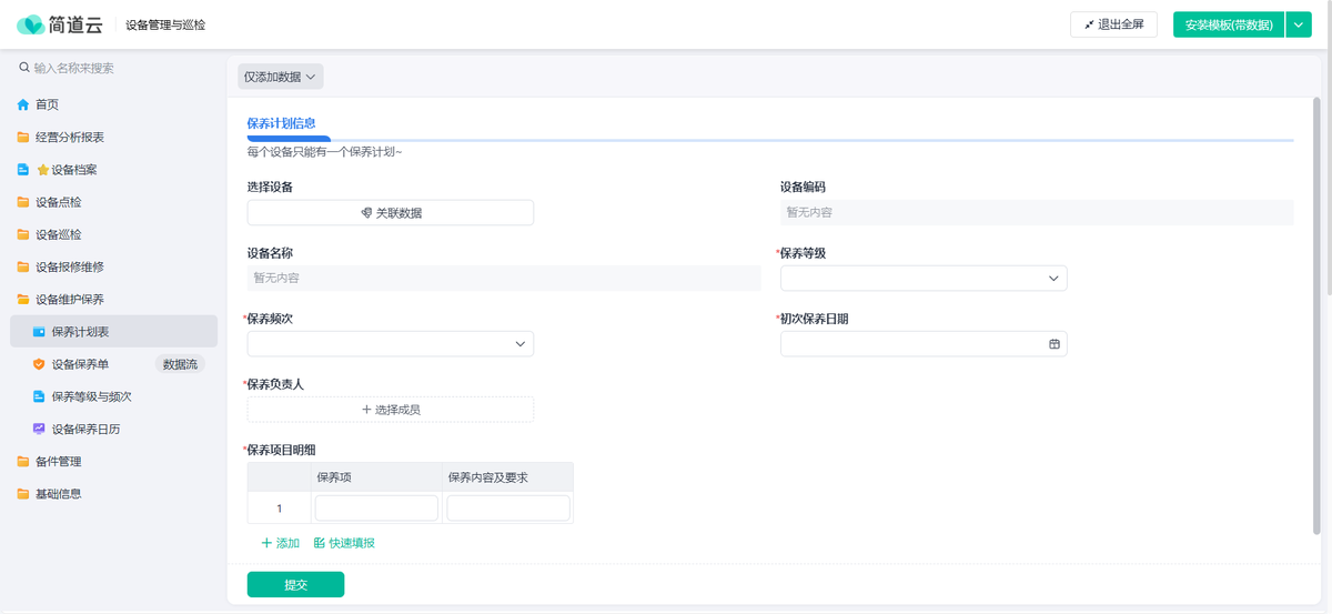 - 保养计划:设置好保养周期,系统到时间自动生成保养任务,推给责任人,再也不怕忘了。