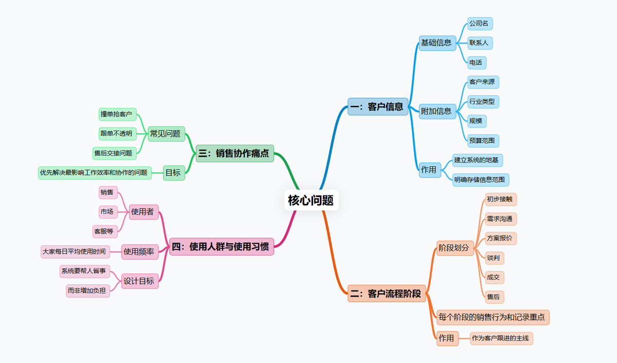 - 谁用?怎么用? 是只有销售用,还是市场、客服也要用?大家每天在系统里花多少时间是能接受的?系统必须是帮人省事的,不是给人添麻烦的。