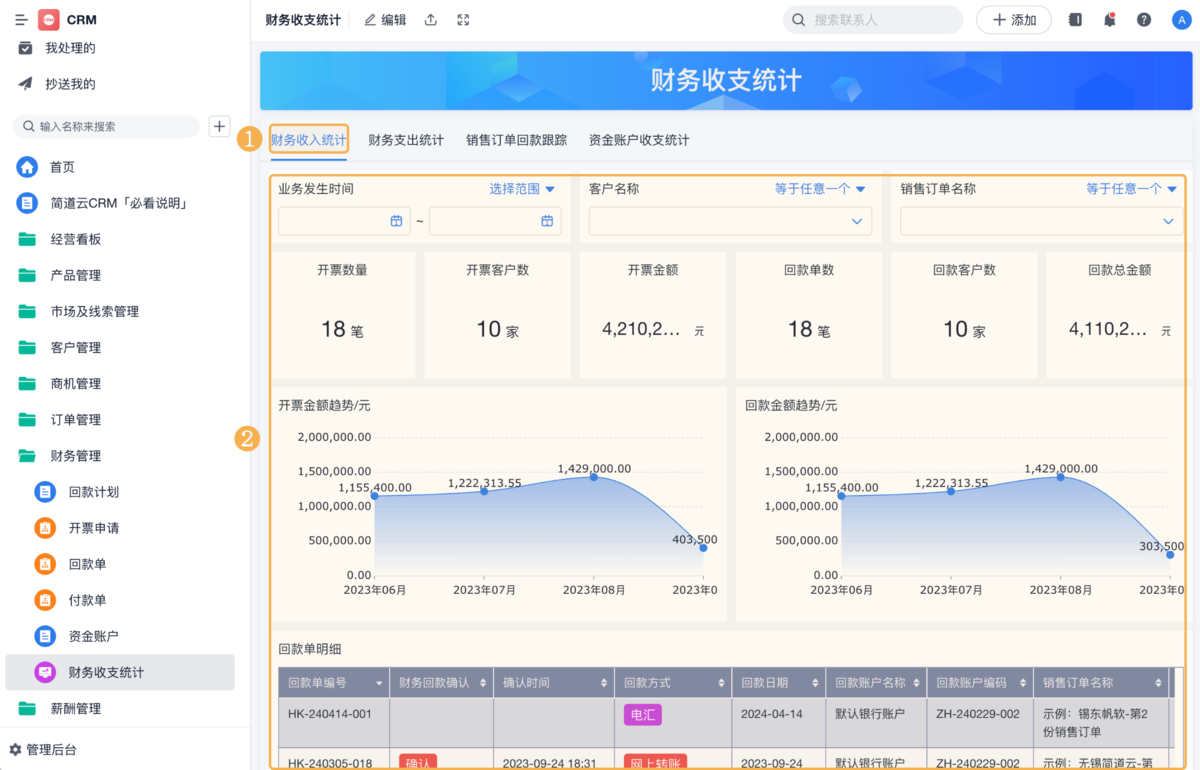 CRM 的财务管理模块,目的就是让收款、付款、利润一目了然。