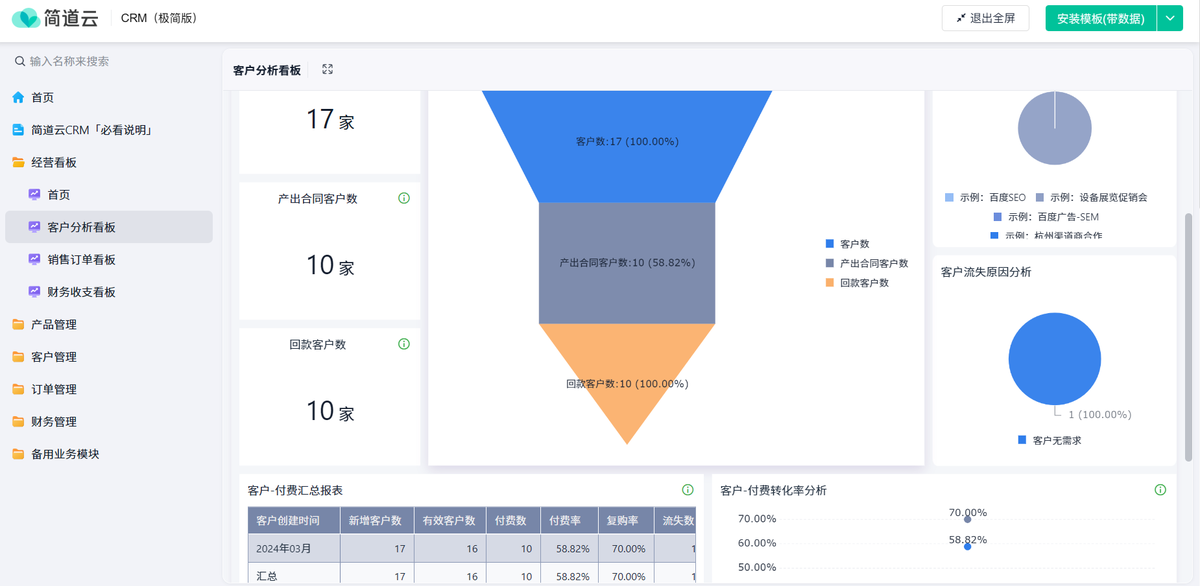 - 销售漏斗看板:潜在客户 → 意向客户 → 成交客户,一眼看出哪一环掉链子。