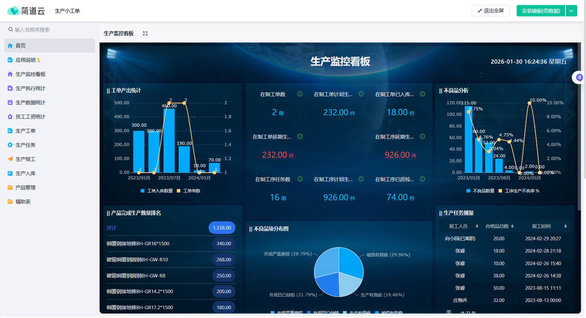- 全流程进度追踪:各生产车间或班组可通过移动端实时报工(完成数量、工时),数据自动汇总,生产进度一目了然。管理者可随时查看在制看板,及时发现瓶颈工序。