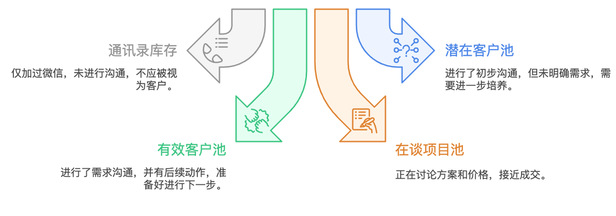- 只加过微信,从来没聊过 → “通讯录库存”,不叫客户池