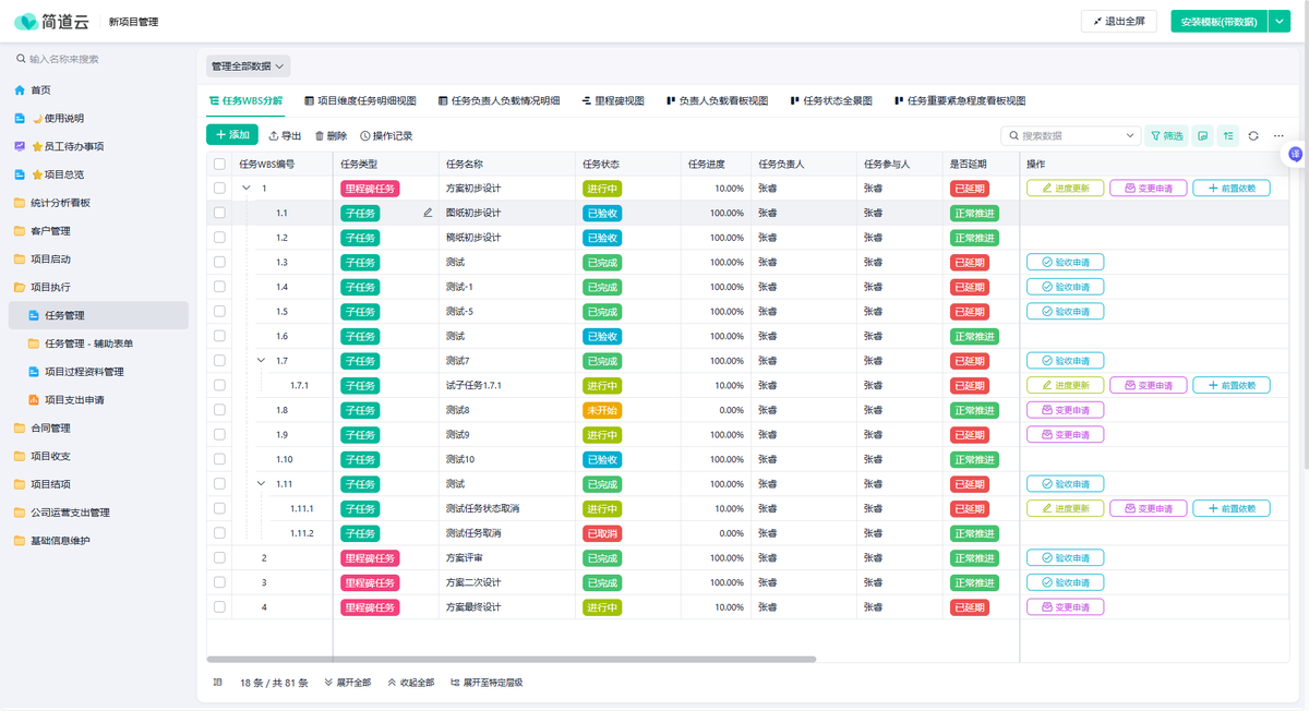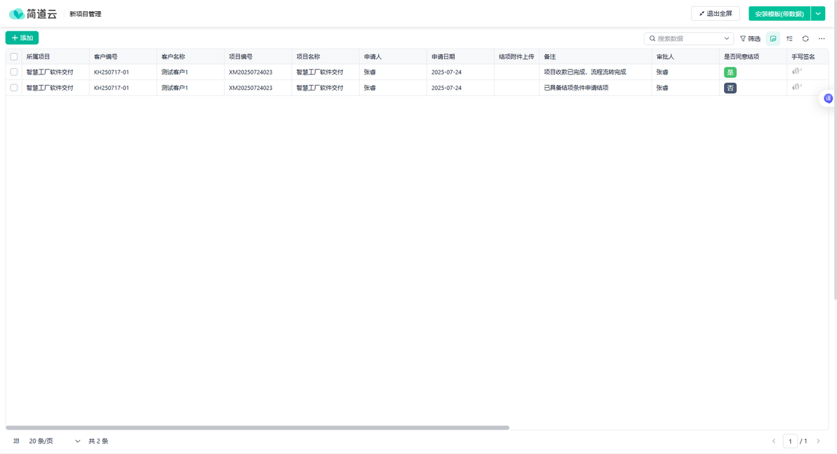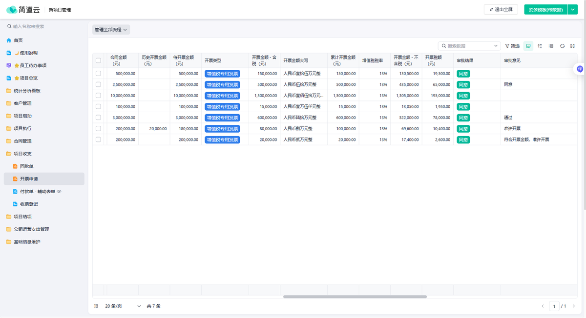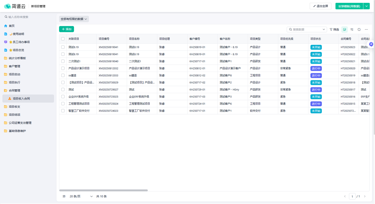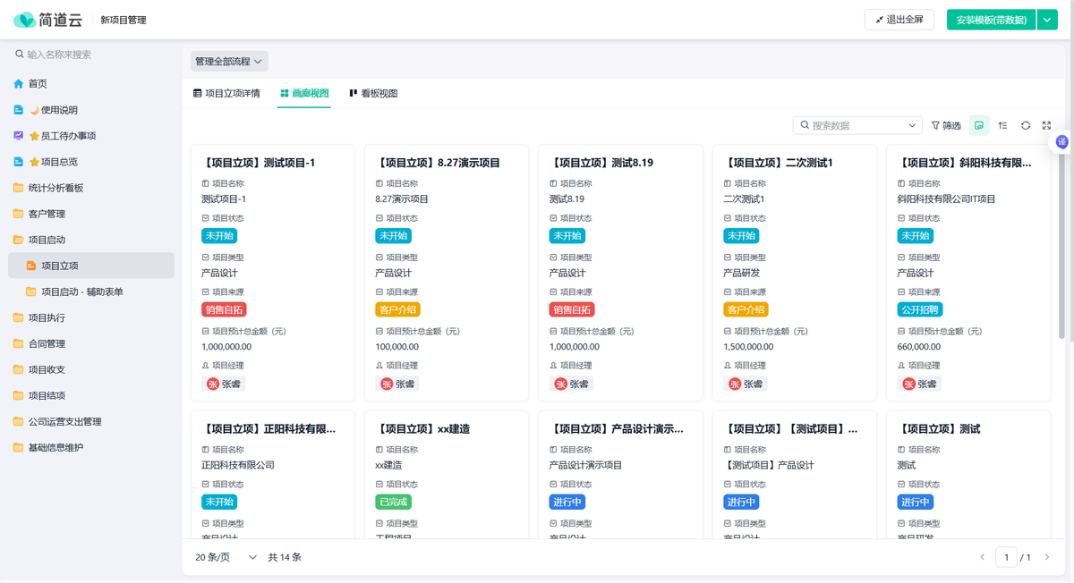 这时候就需要一个工具把这些事串起来。比如简道云这种零代码平台,可以根据上面的六个板块,自己搭一套项目管理系统。客户信息一个表,项目进度一个看板,合同和收支各一个台账,再把这些数据关联起来——哪个客户签了多少钱、项目花了多少钱、还有多少钱没收,点一下就能看到。不用会写代码,拖拖拽拽就能搭起来。