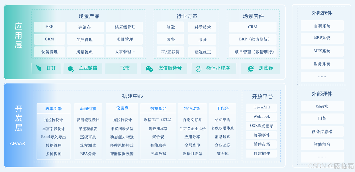 - 开放应用工坊:让客户自己搭应用、改表单、画流程。 比如金蝶、用友都推出了低代码开发平台。
