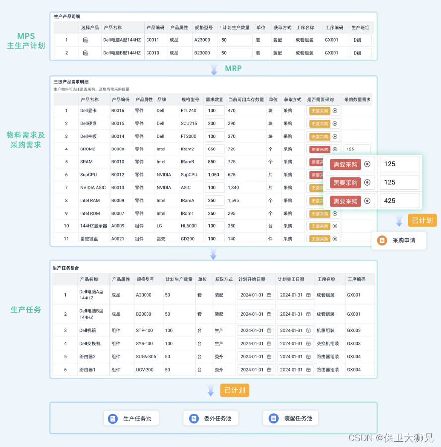 - 支持动态计算库存与领料关系,在生产变更时自动同步采购;